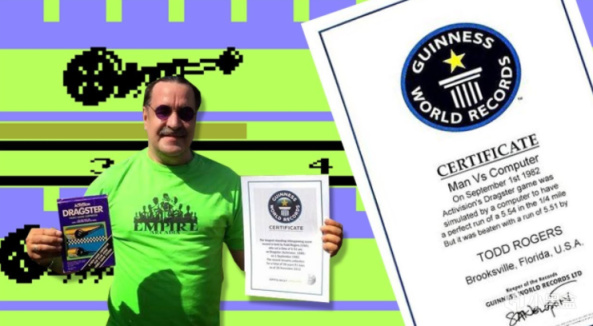 當時電子遊戲圈“速通”的概念剛剛有了雛形,而ToddRogers也不例外,開始嘗試把自己的成績投遞給廠商,以獲得廠商證明,他選擇的第一個遊戲,就是動視(Activision)爲雅達利2600遊戲機製作的遊戲《改裝賽車》(Dragster),當時他聲稱自己獲得了5.51秒的遊戲成績,這款遊戲因爲本身就是競速作品,自帶計時器,這種始祖級的“速通”遊戲當時在玩家間很有市場,遊戲本身的操作很簡單,因爲雅達利2600的控制器就一個搖桿一個按鈕,但是真要讓賽車能夠跑得夠快,對於按鍵和搖桿的時機配合就有很嚴格的要求。而ToddRogers5.51秒的記錄堪稱一騎絕塵,第二名連他車尾燈都看不見,這個記錄一直都沒有被人打破,2012年吉尼斯甚至還爲他認證了“保存時間最長的遊戲記錄”。
