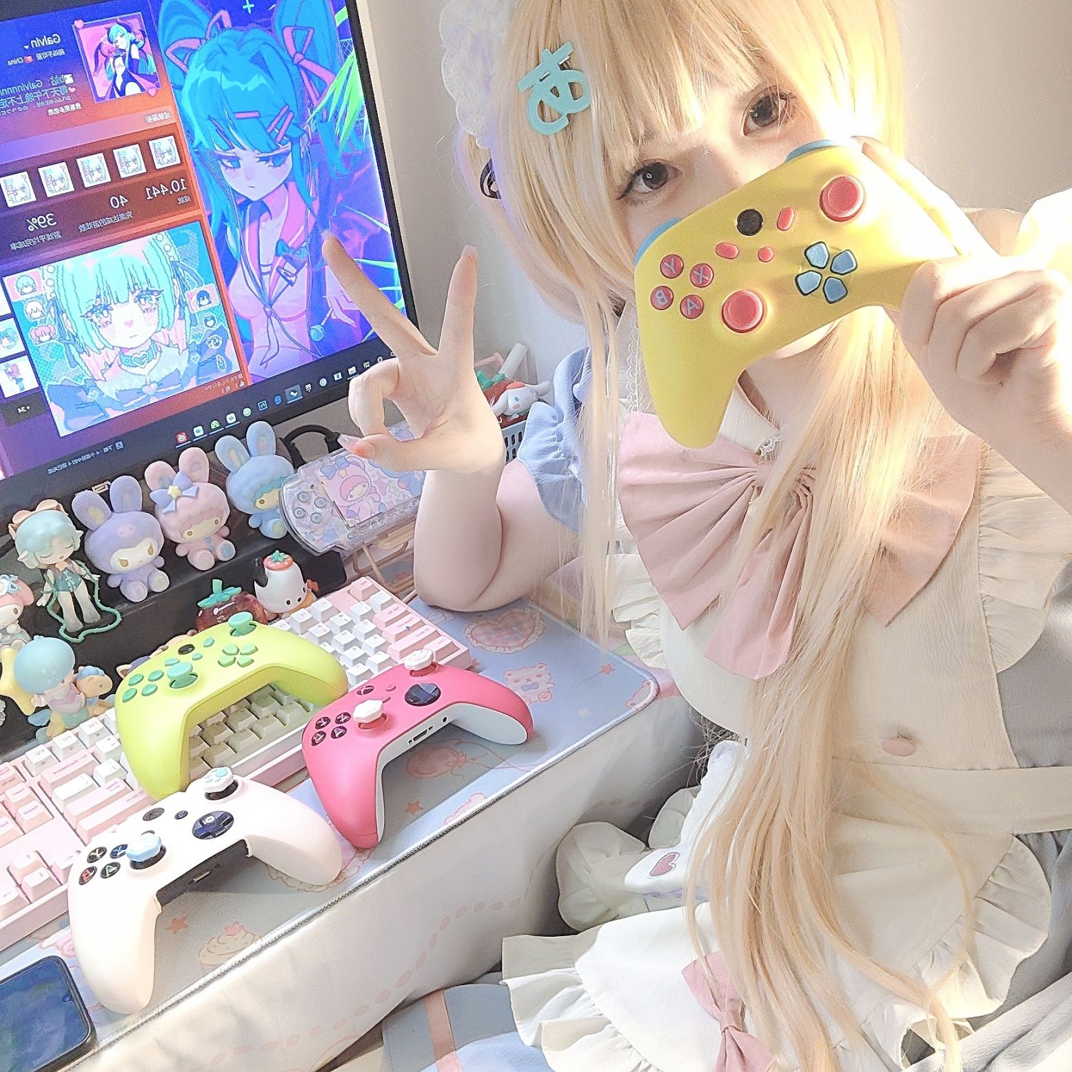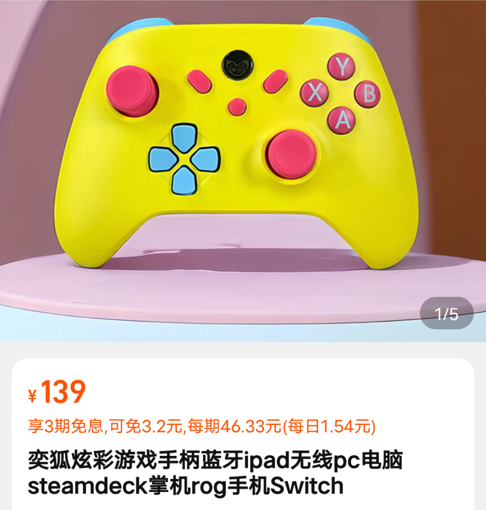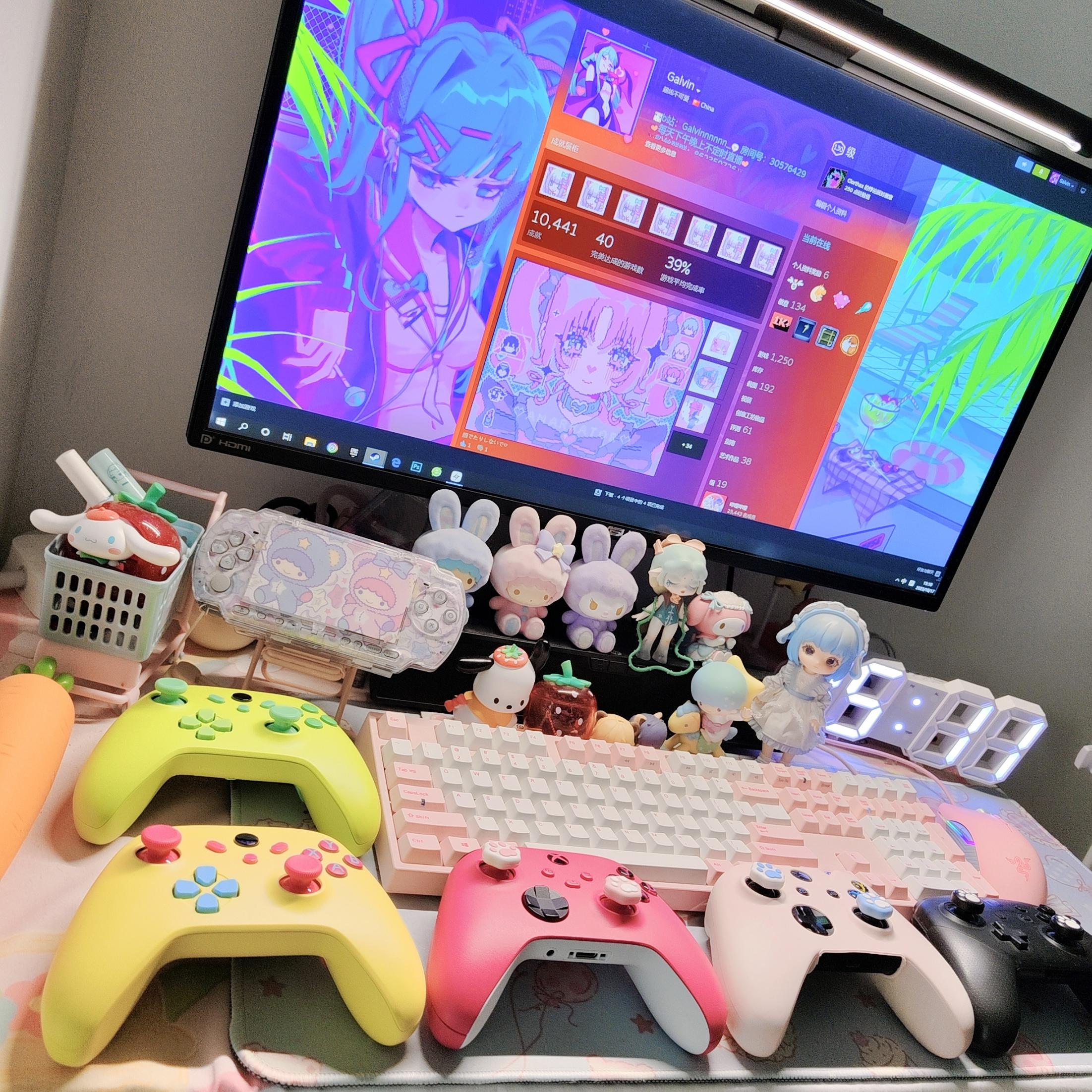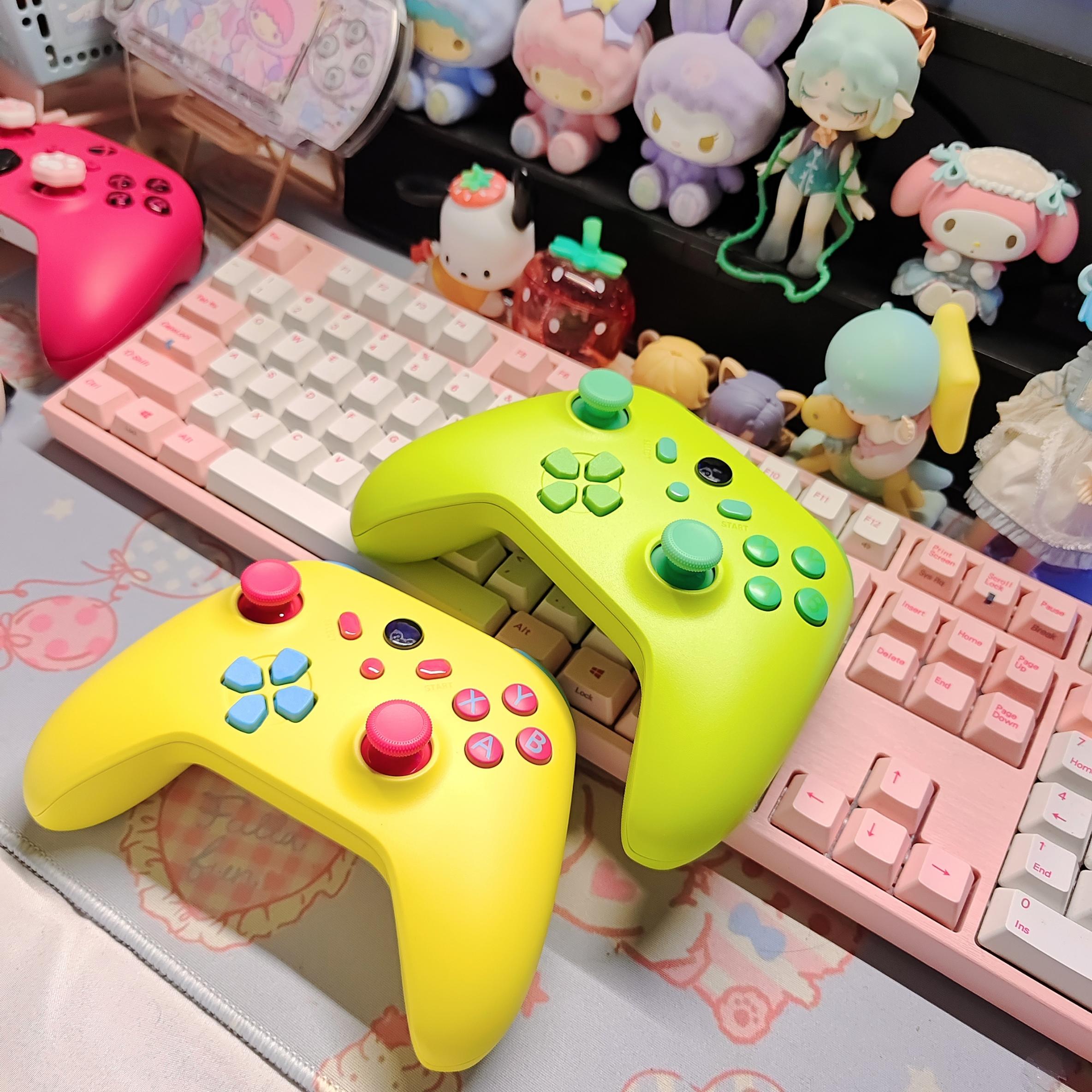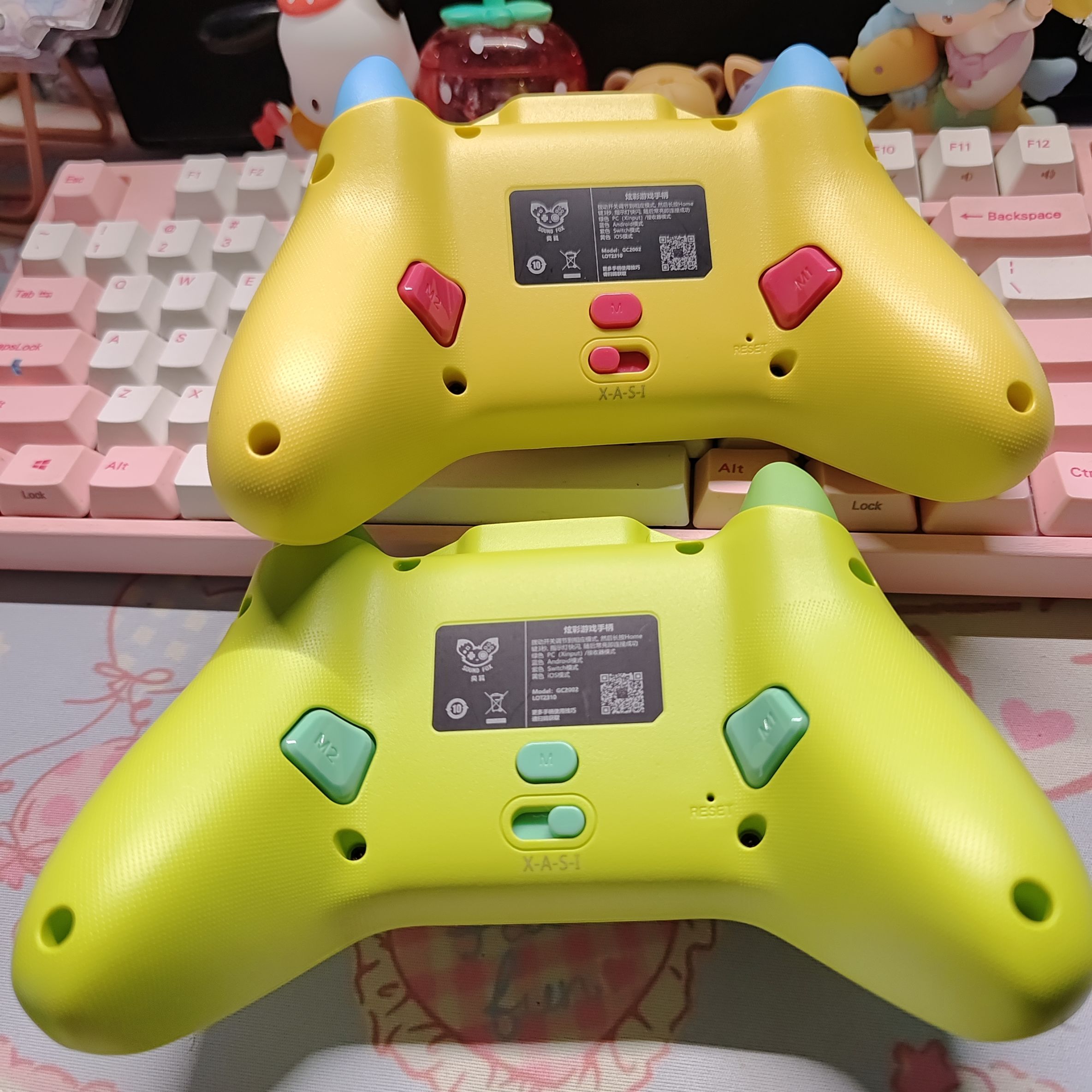 打開看到手柄實物後,自我感受比最早看到的官方圖好看多了!不得不說配色挺大膽,色彩飽和度都很高,因爲我的外設基本上都是粉藍淺色,這兩個黃綠色小玩具放在電腦小桌桌上面也挺和諧的。實物綠色比黃色耐看!拍照可能黃色更上鏡是真的,不過實物略扎眼。