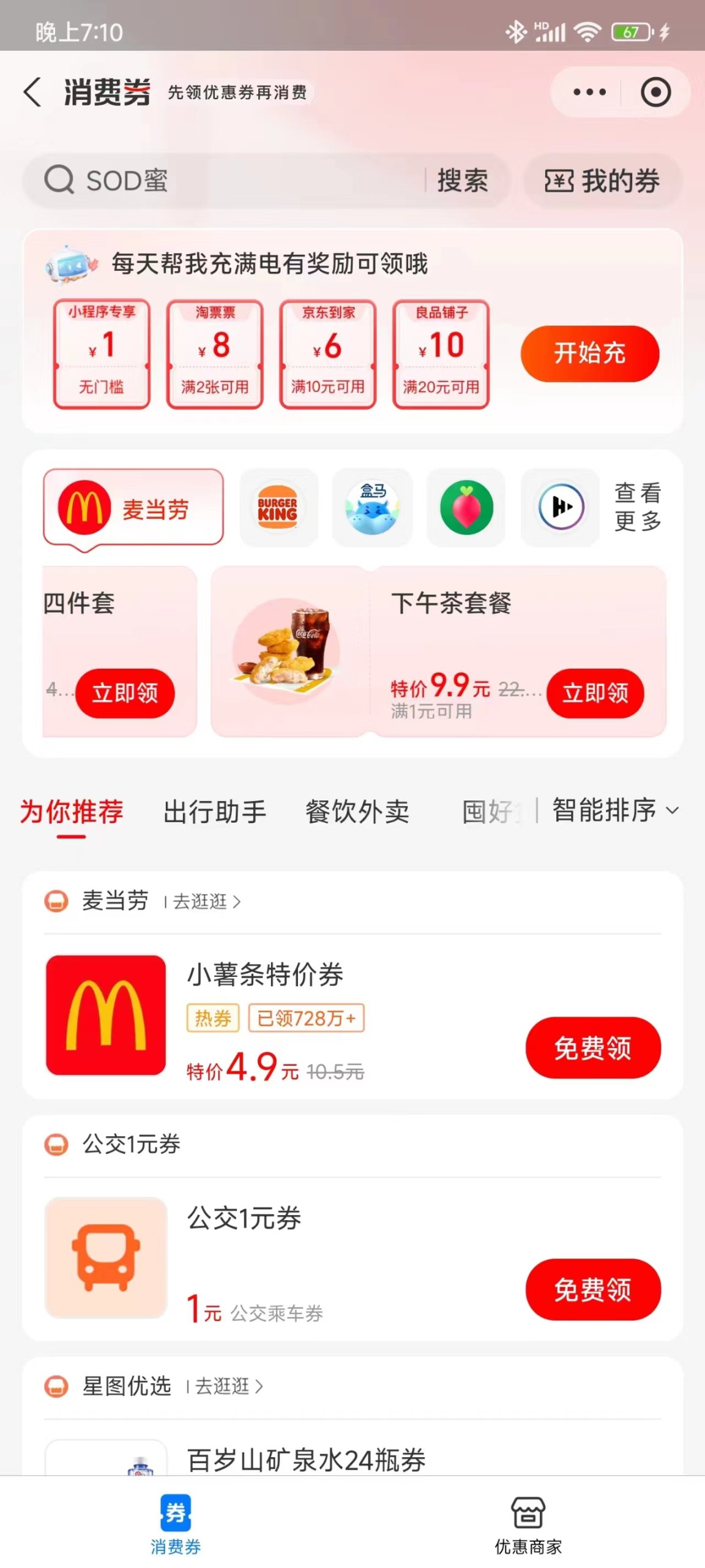 除了搜麥當勞,在支付寶裏從消費圈點進消費券裏,這裏時不時也會刷新一些0元券。