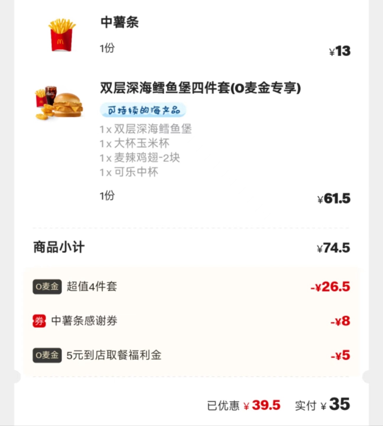 但一個套餐基本很難到39用券的價格,我這裏一般是在小喫上面加點錢,再用一張5元中薯的券去湊單。