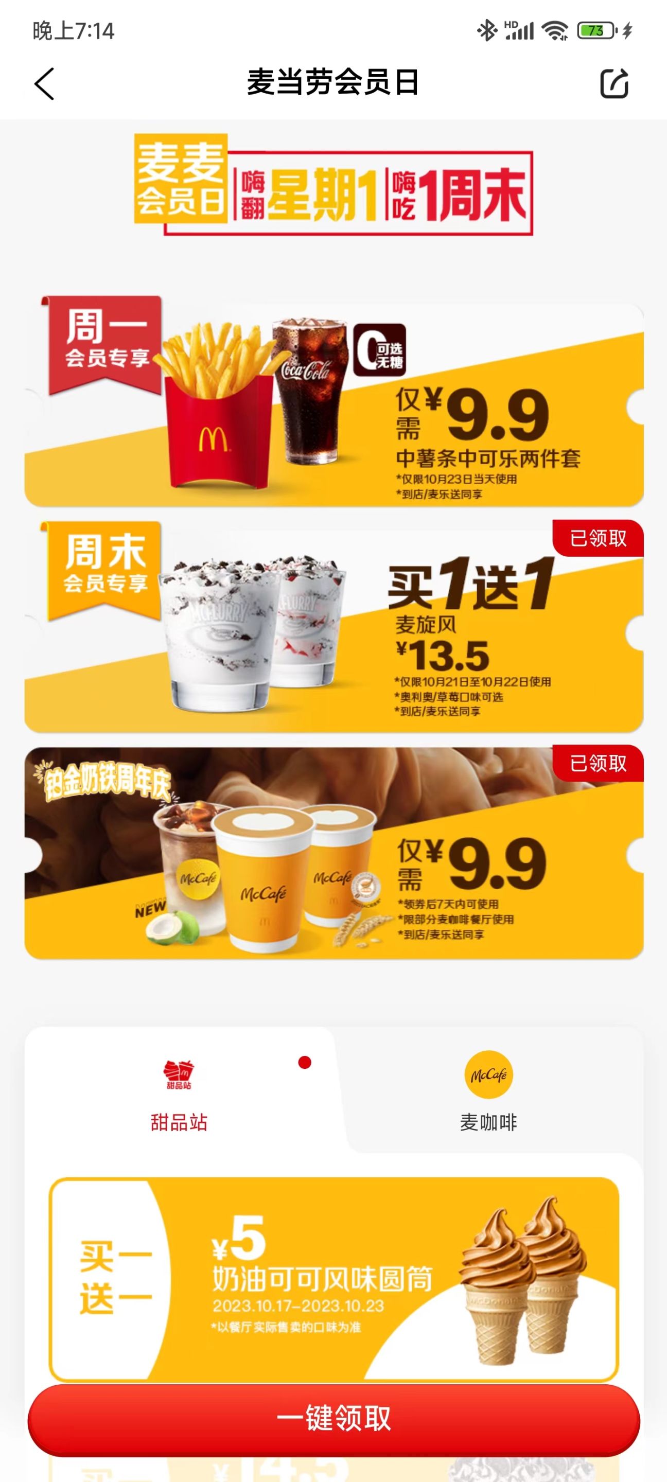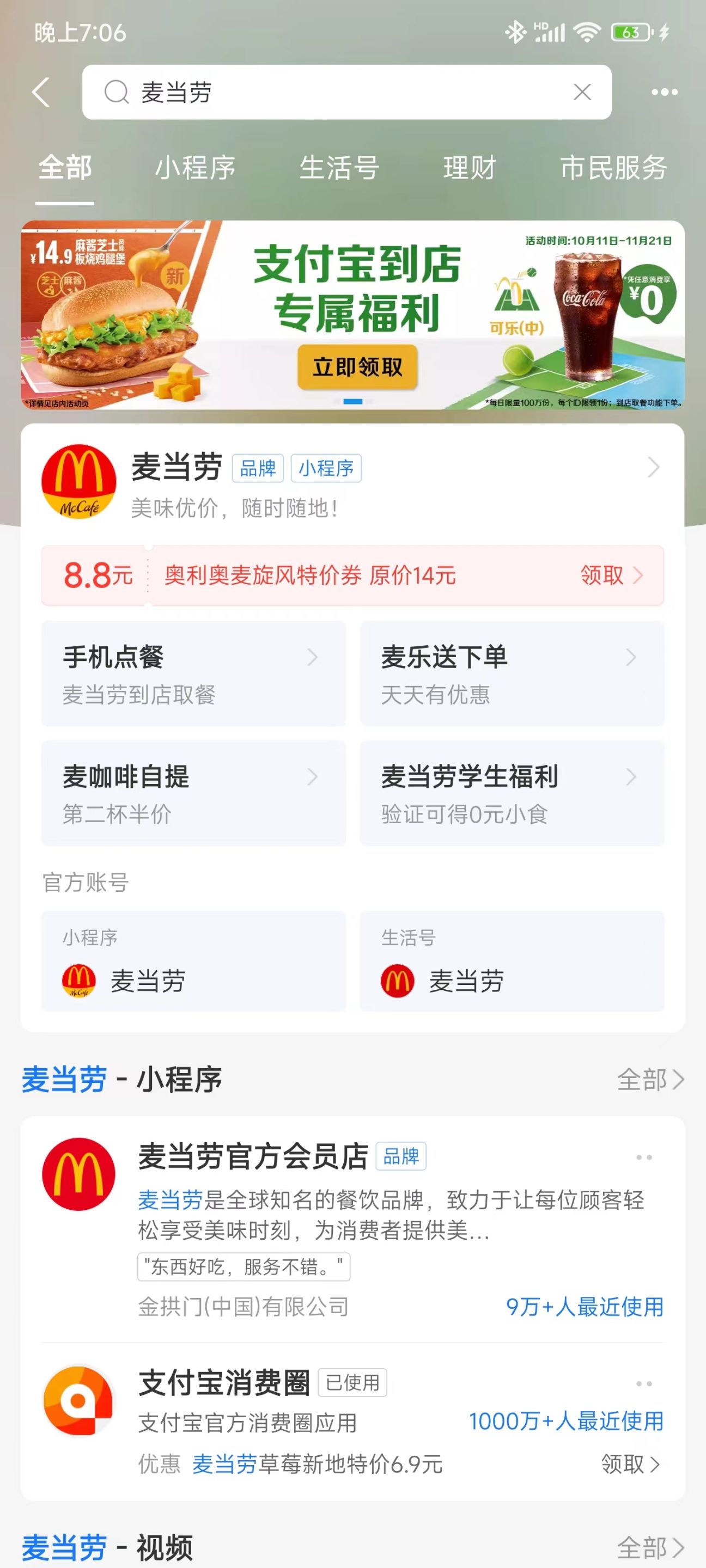在領券方面,我個人常用的基本就是支付寶了,首頁搜麥當勞經常會給一些0元券,配合1+1下單還是很香的。