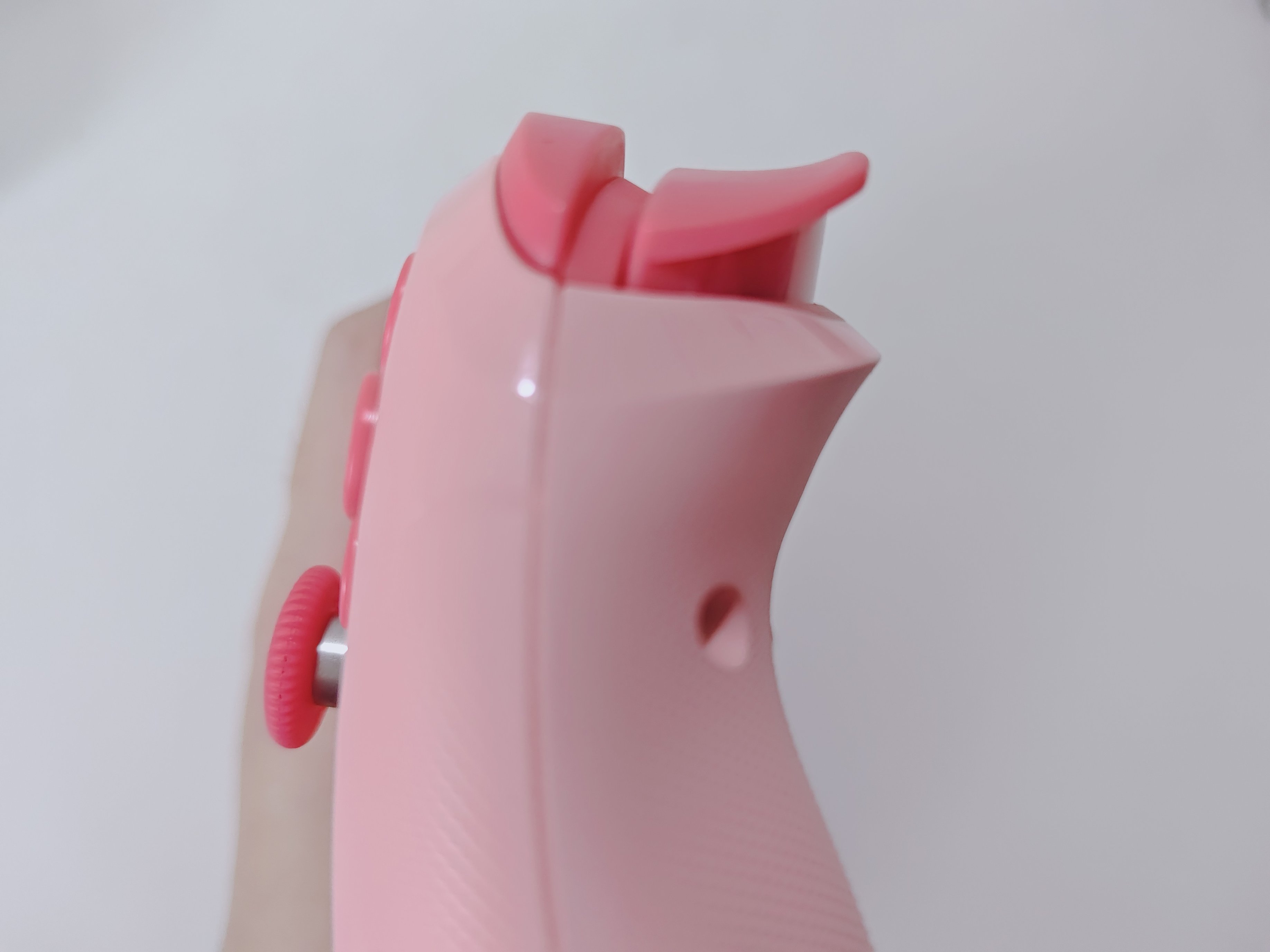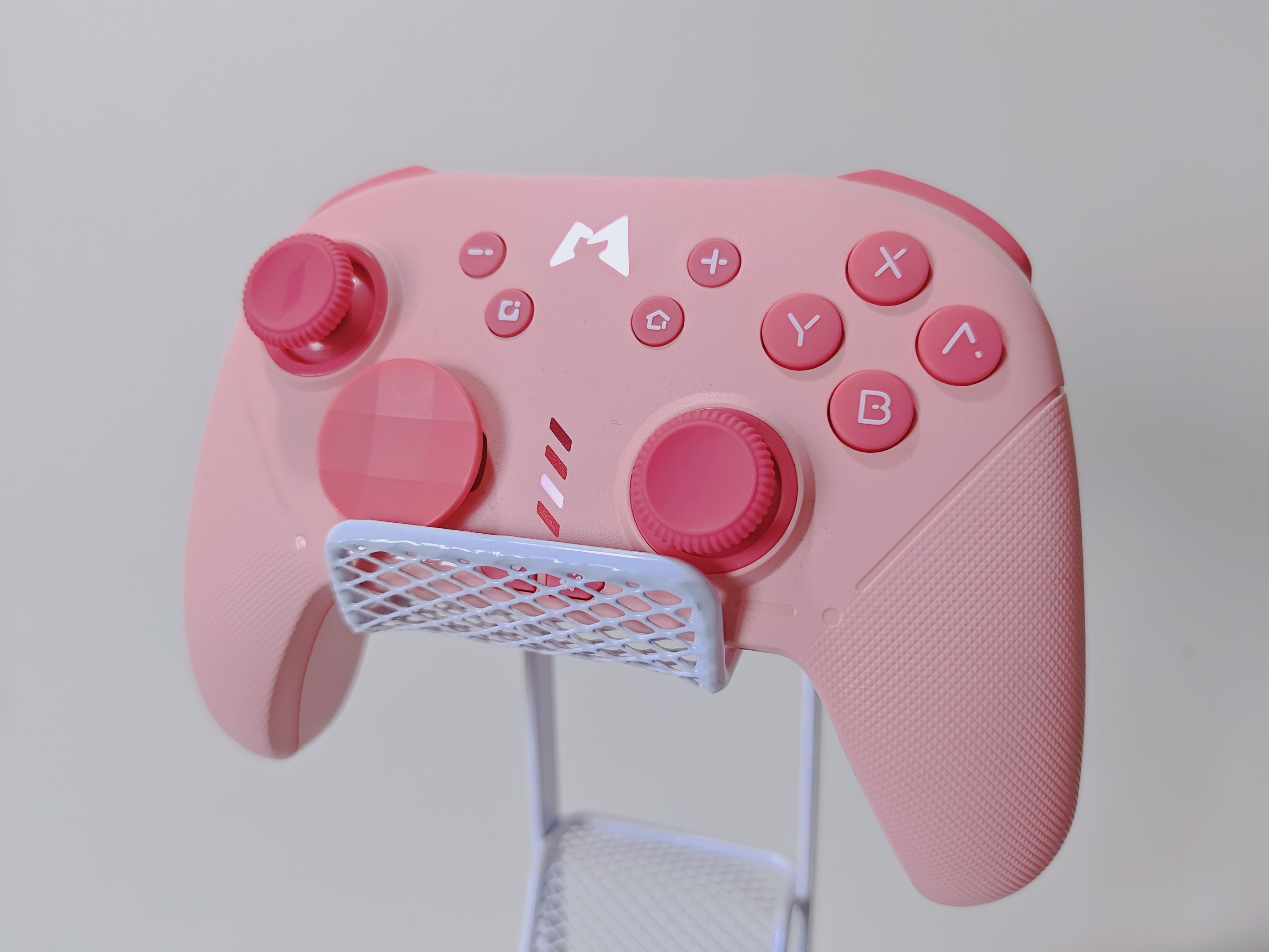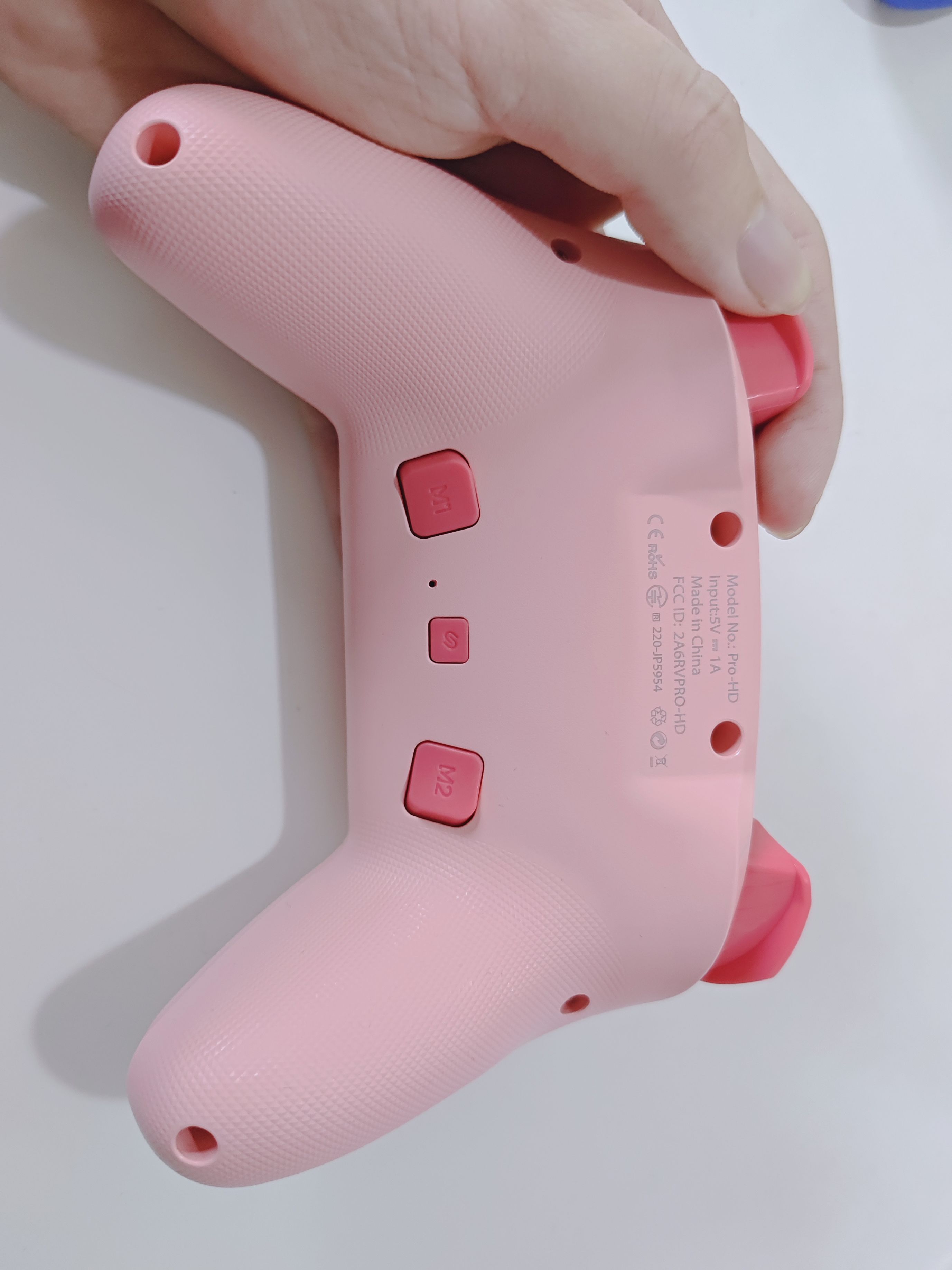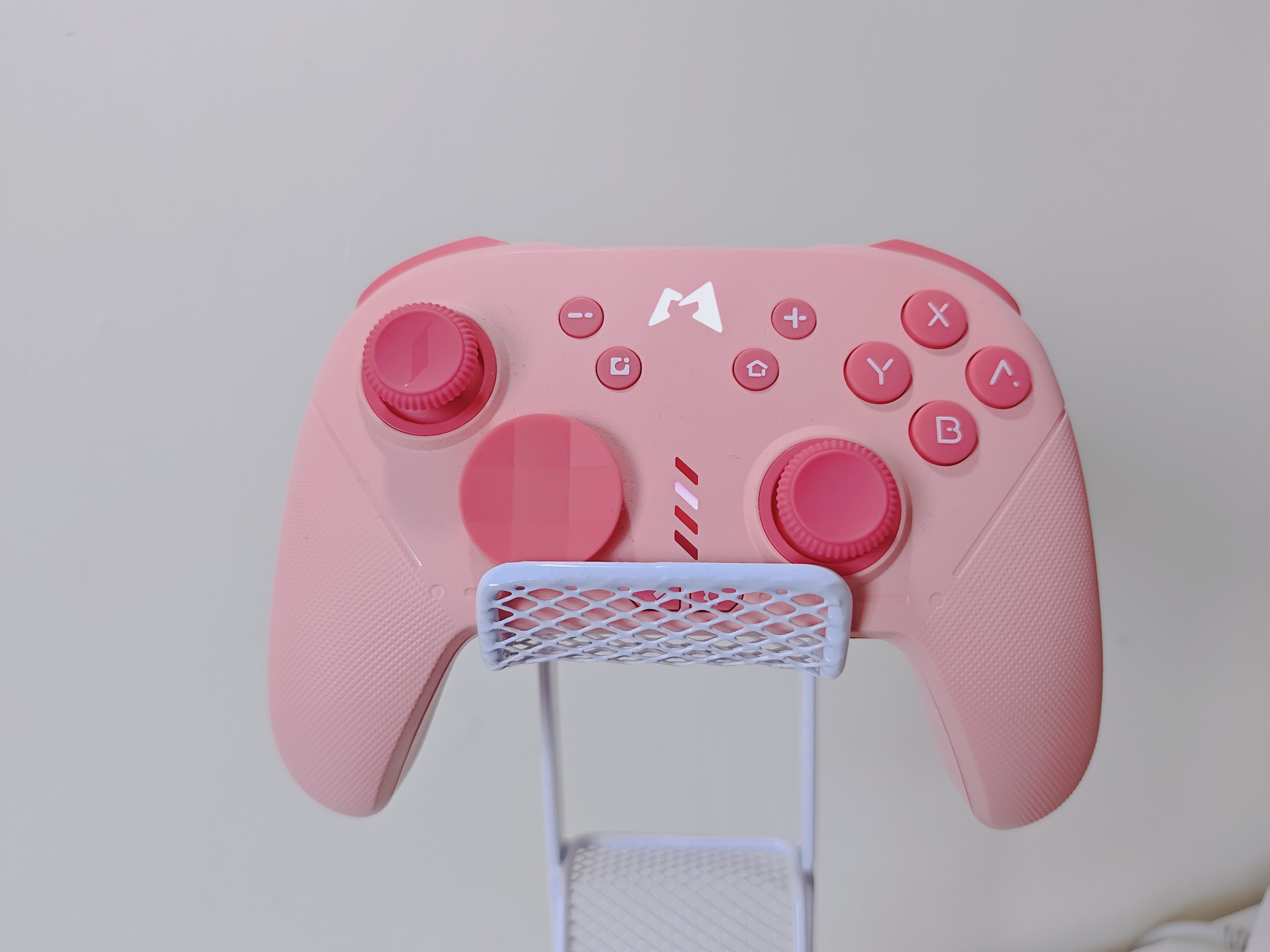 魔派赤兔的外观还是非常漂亮的。手柄是类Nspro的模具与布局,同时在手柄的中间还带有rgb灯带,更显美观与炫酷。最初的赤兔配色版本是红白配色,而此次的魔派赤兔给玩家带来了樱花粉色版本,让这款手柄更显甜美可爱,可谓是既斩男又斩女。