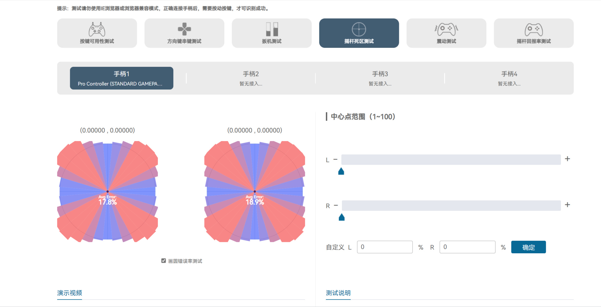 在有线或蓝牙连接下,赤兔会被识别为nspro。魔派赤兔的摇杆为方形调教,默认会有10%的死区。但是有线模式下切换成Xbox模式可以调节成为无死区。