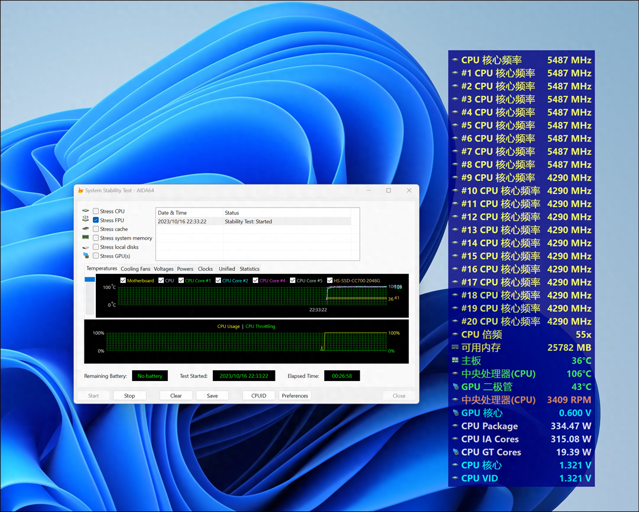 由于14700K的最大功率来到了334W,简直是发热大户。我是用AIDA64 单烤FPU 25分钟,CPU频率拉满,一直没降频,中央处理器稳定在106℃。