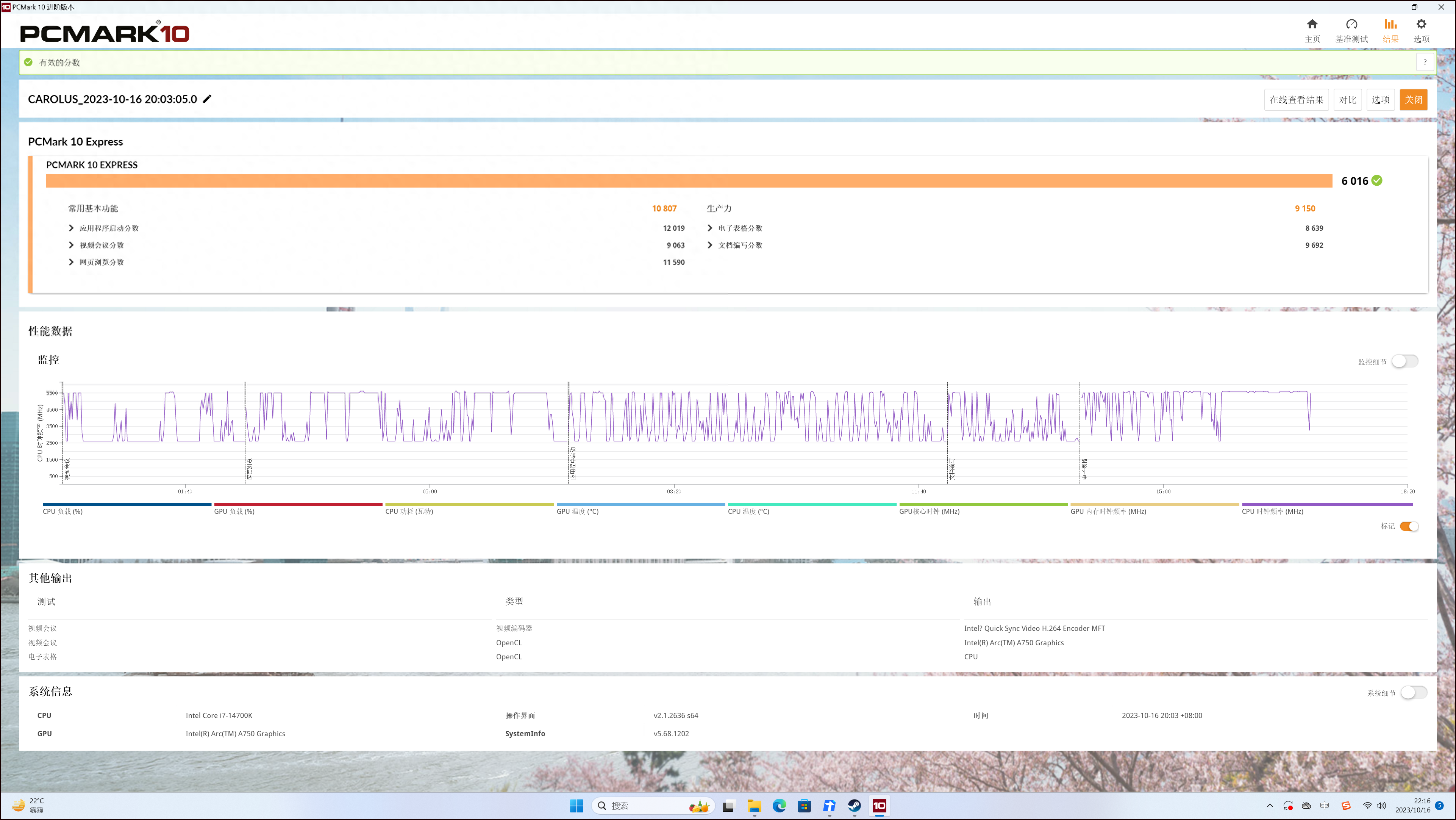 那么14700K在这次的测试中,整体得分为6016分,在基本功能中的分数为10807,生产力的得分为9150。