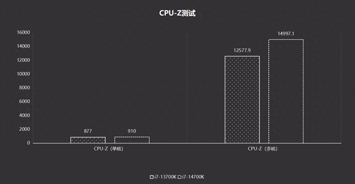 我们以13700K为参照,可以看到:在默频状态下14700K以910分比13700K性能强3.8%,多核则是以14997优于13700K 20%,实力还可以。
