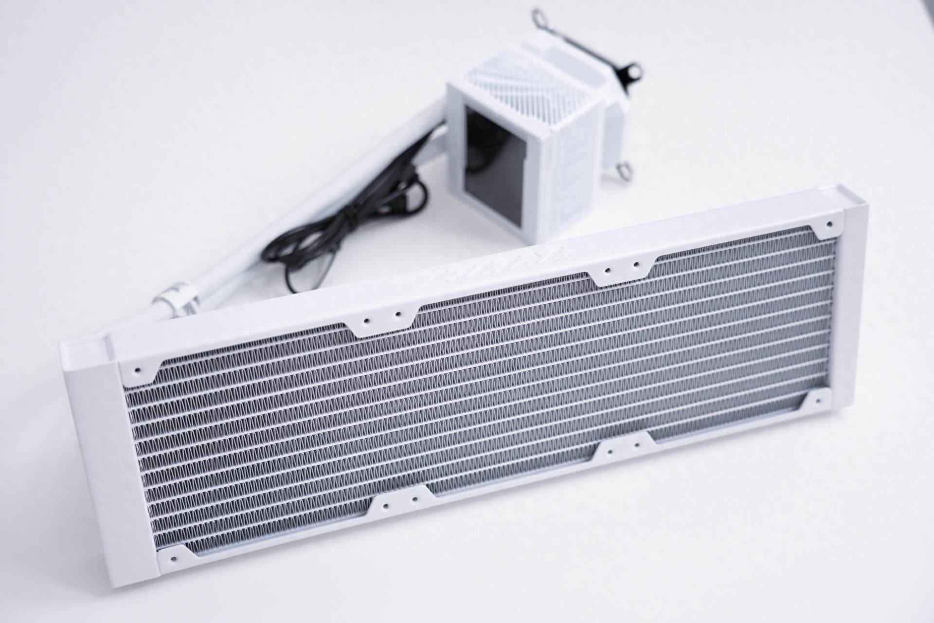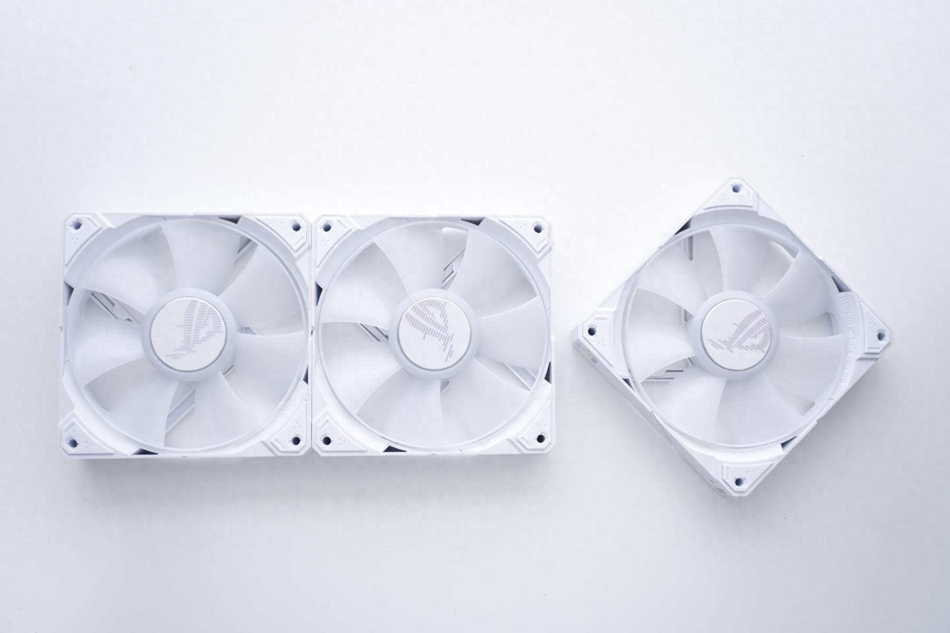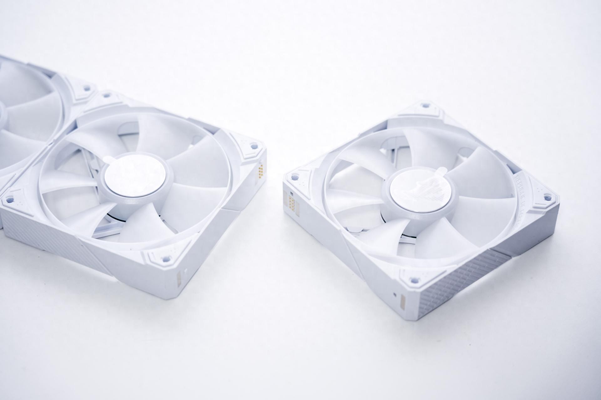 风扇方面,这次ARGB版水冷使用的是磁吸连接的风扇,侧面有触点和磁贴,安装之前风扇就可以自己吸附到一起,非常方便。而且也支持一线通,一根线就能控制多把风扇的转速和灯效,这样3把风扇只需要一根线就行了,走线理线变得更加轻松。
