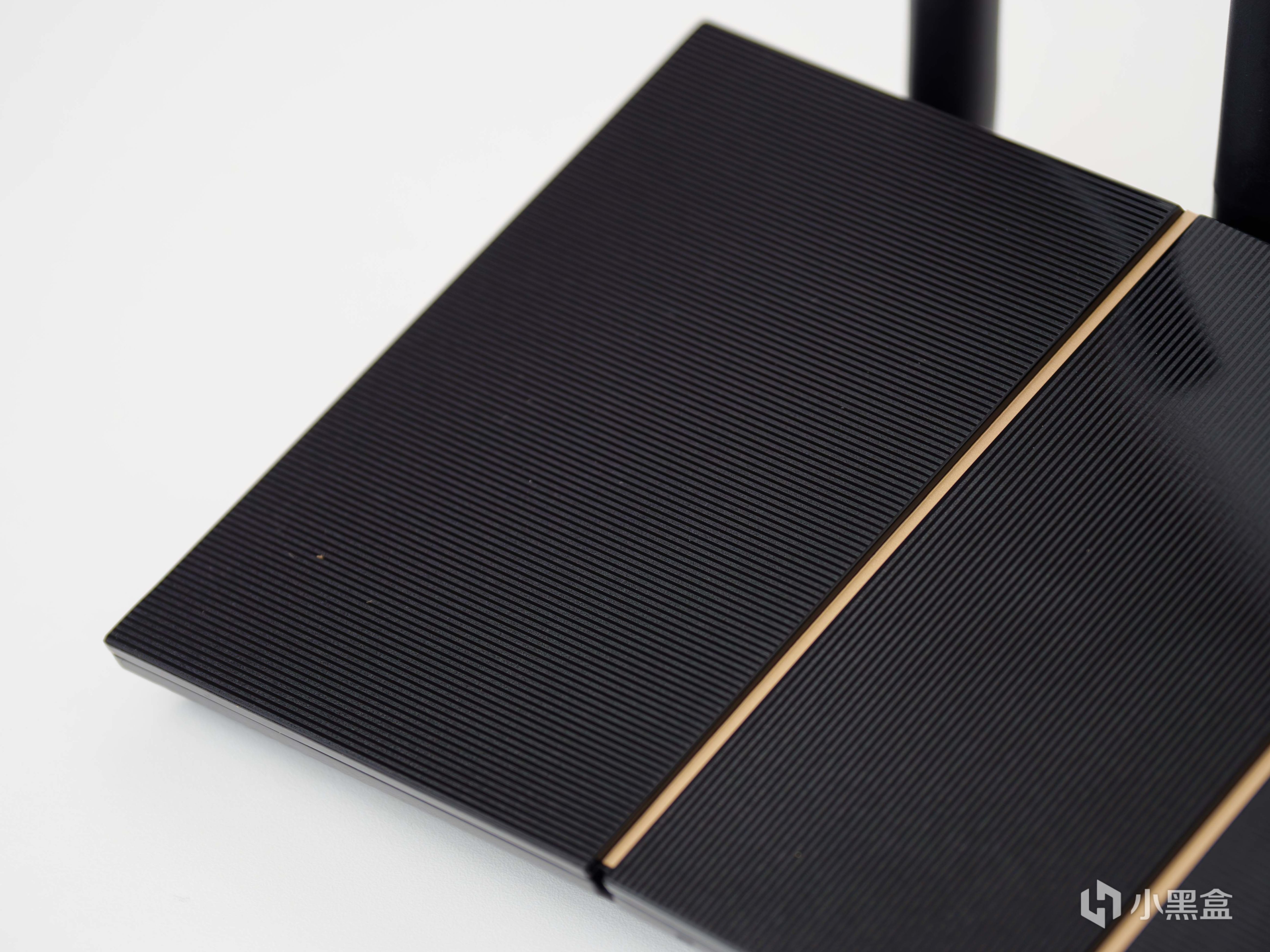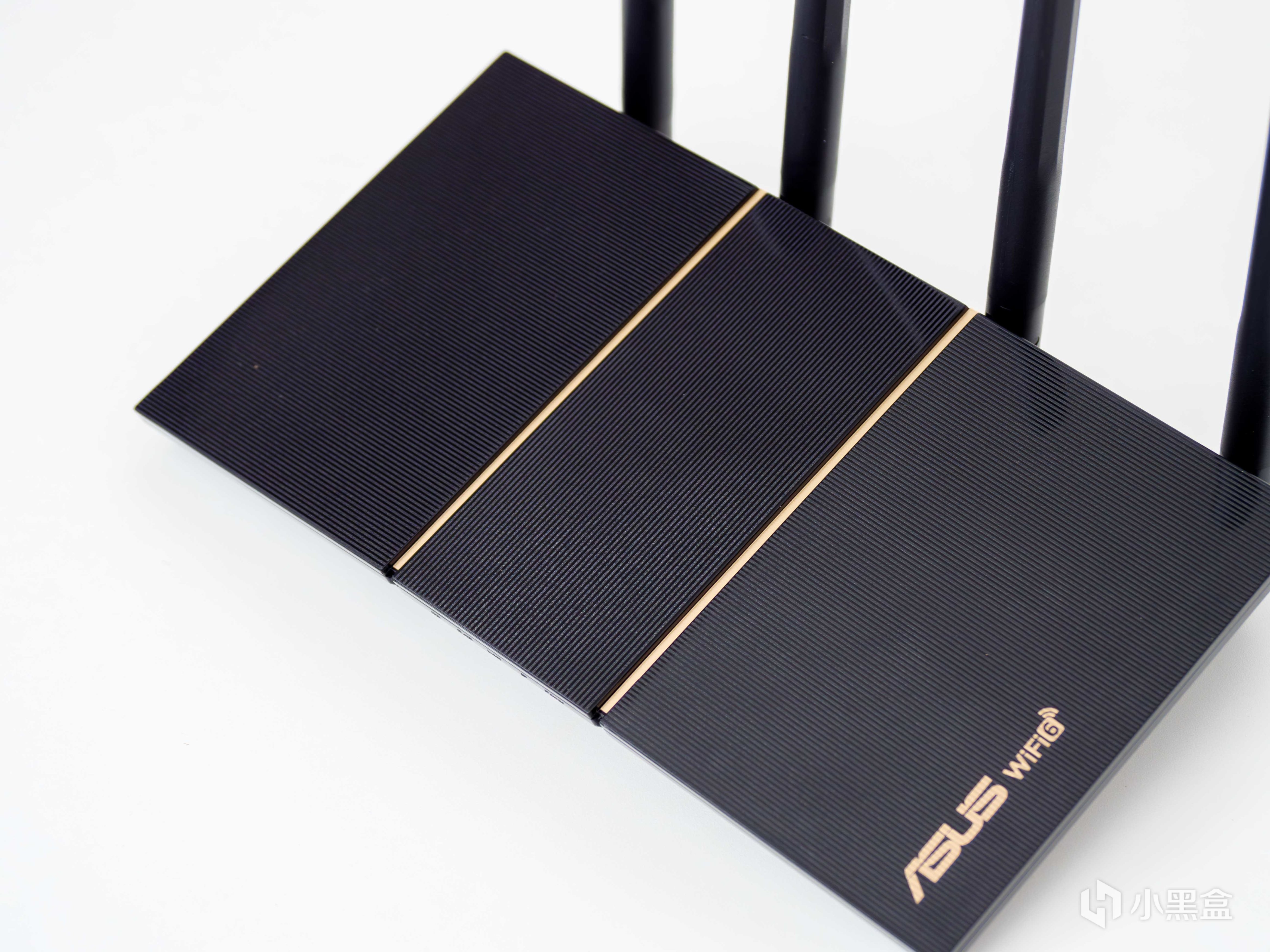 不过华硕还是尽力给这台路由器增加了一些细节化的处理,比如在路由器正面为三平面构成,显得棱角分明。并且华硕使用了金色LOGO和金色的暗槽装饰,同时路由器正面使用了刻线条纹,让整机观感显得不那么单调。