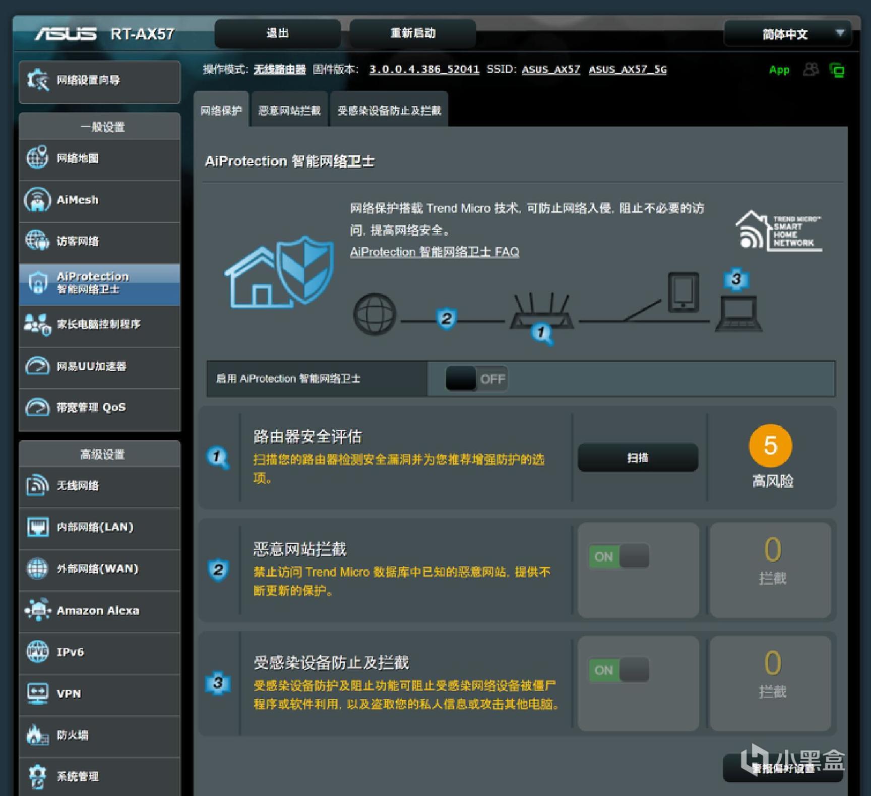 华硕路由的AiProtection智能网络卫士功能可以检测路由器的安全漏洞,并且自动拦截恶意网站和中毒的设备等: