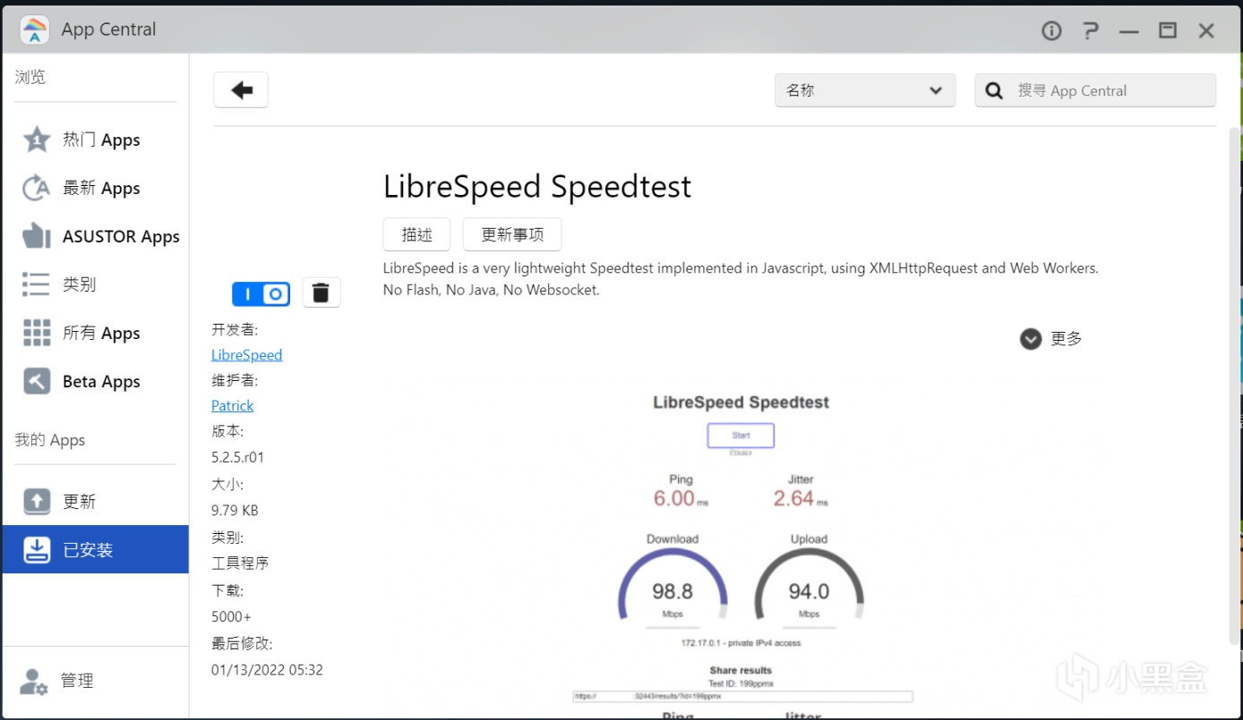 所以这里我使用了爱速特AS6704T上的LibreSpeed Speed套件作为测试工具。爱速特AS6704T本身就拥有两个2.5G LAN口,配合弱电箱里的2.5G中枢交换机,可以满足WiFi 6协议在2x2 MU-MIMO 160MHz下2402Mbps的速度上限。由于本次华硕RT-AX57各网口均为千兆,更是能轻松满速测试需求。