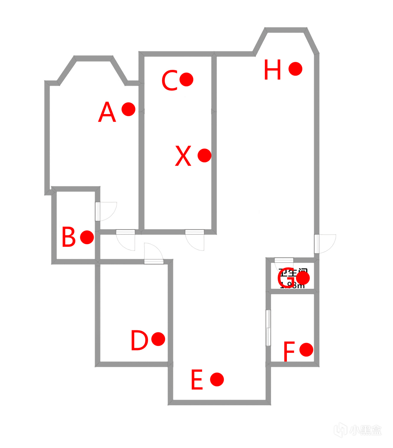 测试场景是我家房子中,房产证面积154㎡,实际面积142㎡左右。为了直观的测试RT-AX57的覆盖效果,将其放在了位于房子中央卧室的X点处: