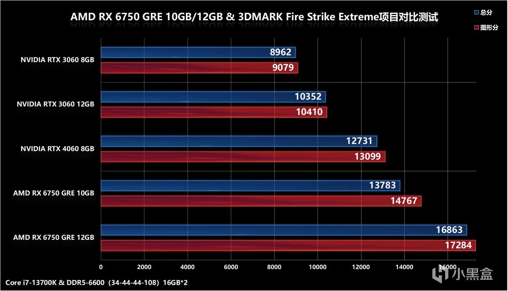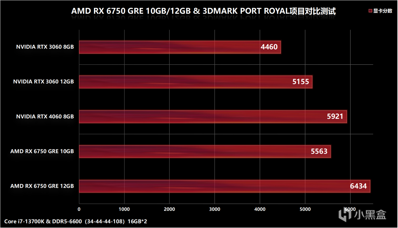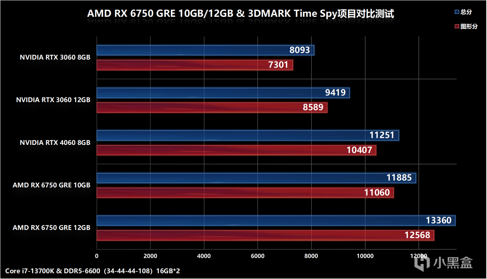 先来看看3DMark Fire Strike Extreme和Time Spy这两个项目,分别对应DX11和DX12两种API,显然在传统跑分上,两款RX 6750 GRE均呈现出压倒性的领先优势,定位低一些的RX 6750 GRE 10GB也能领先RTX 4060达到10%以上,而这五款显卡中定位最低的RTX 3060 8GB,它和2K分辨率是格格不入的,和仅相差300元左右的RX 6750 GRE 12GB差距达到了70%以上。