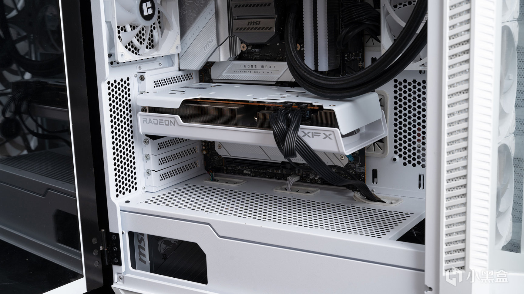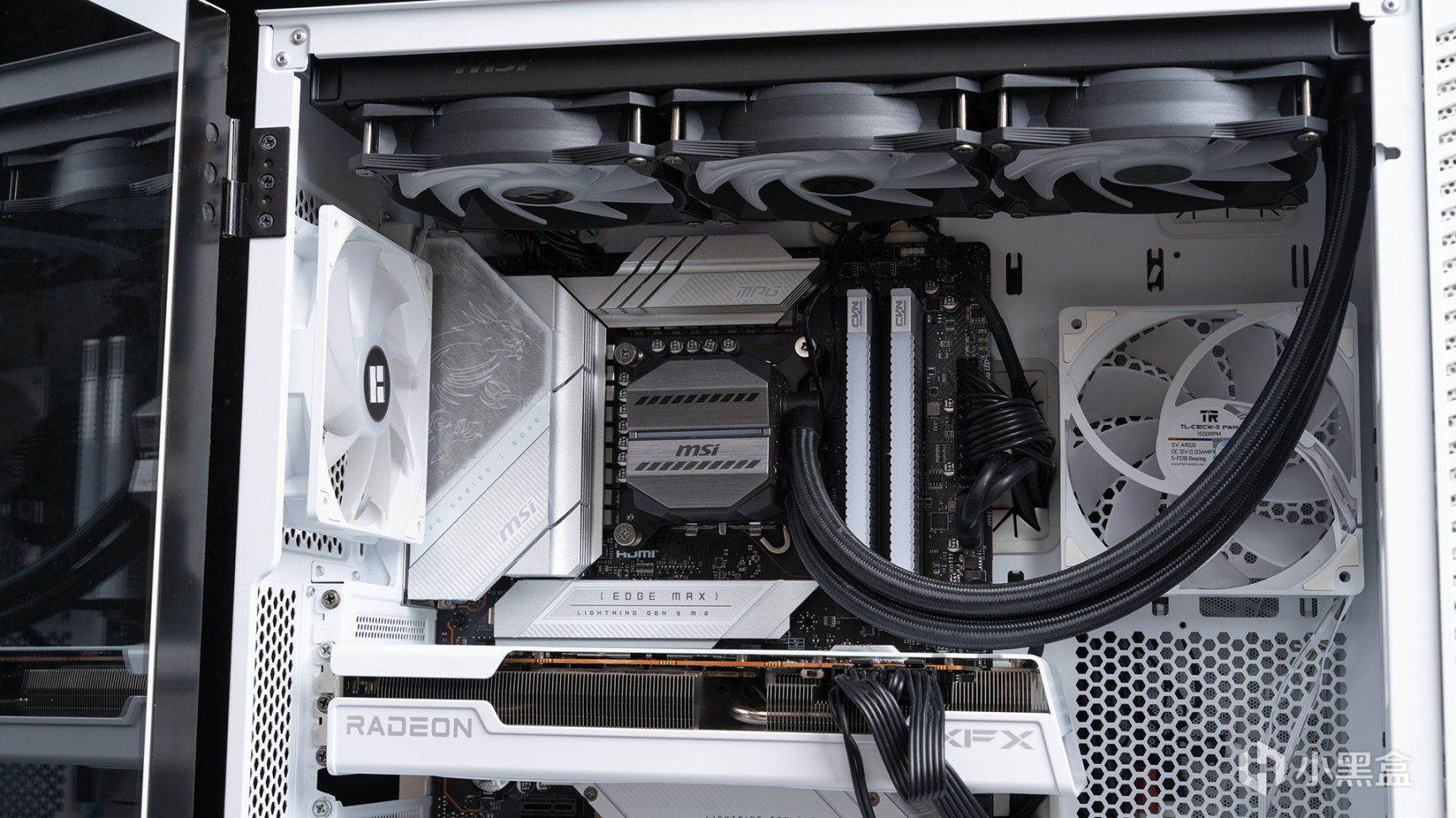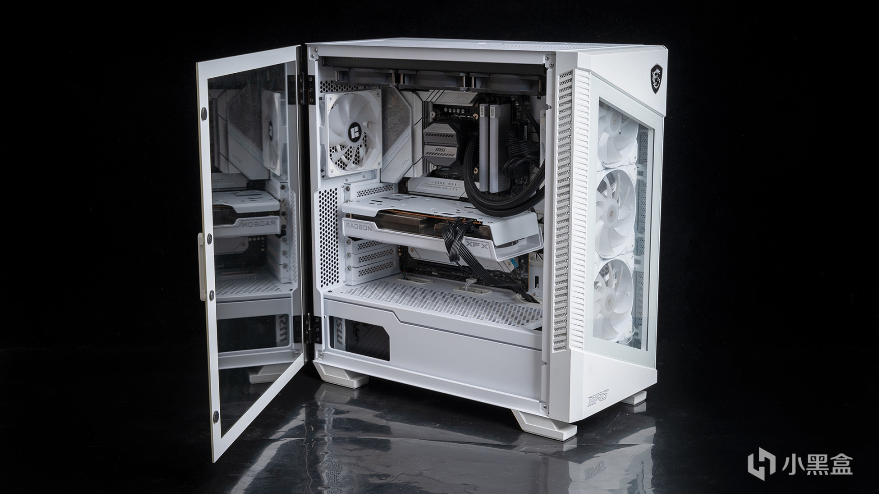 为了符合日常玩家的真实使用场景,本次测试进行封箱处理,使用的微星这款MPG VELOX刀锋100R白色版本,本身配色就和RX 6750 GRE 10GB雪狼显卡比较搭,前面的三风扇+半透面板类似于海景房设计,侧面和后置也安装了散热风扇,顶置则是M360迫击炮AIO水冷,属于散热性能和颜值兼顾的机箱。