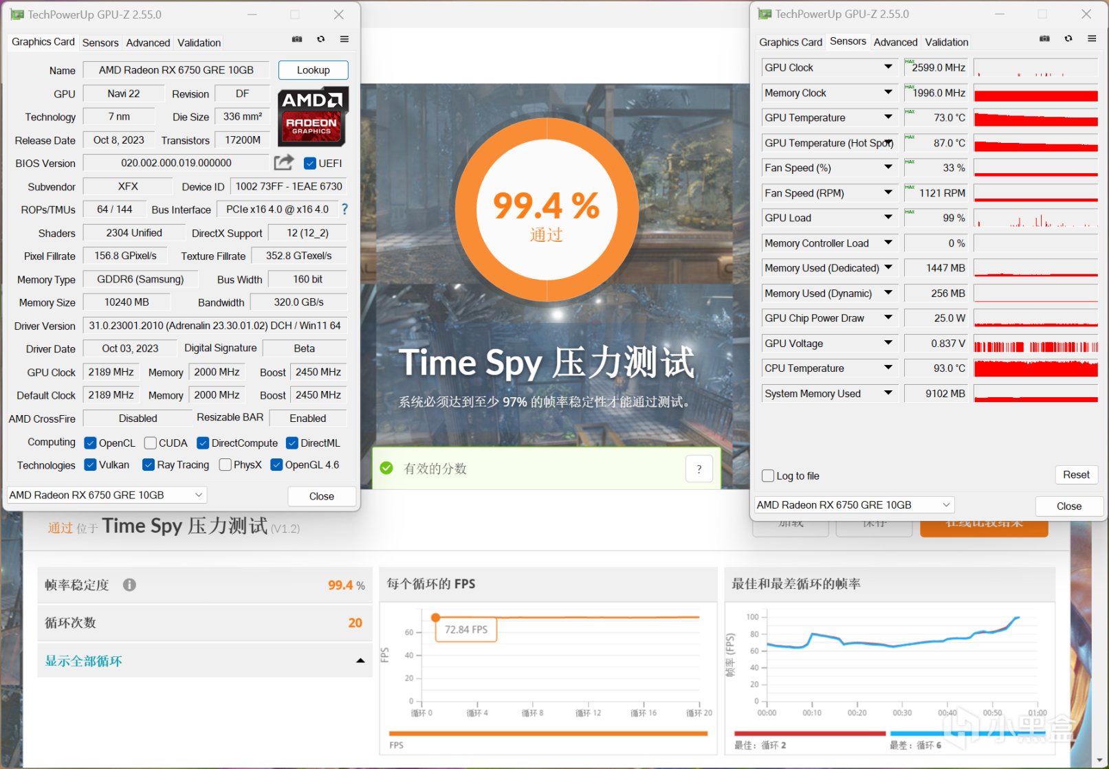 RX 6750 GRE 10GB雪狼在Time Spy压力测试中通过率为99.4%
