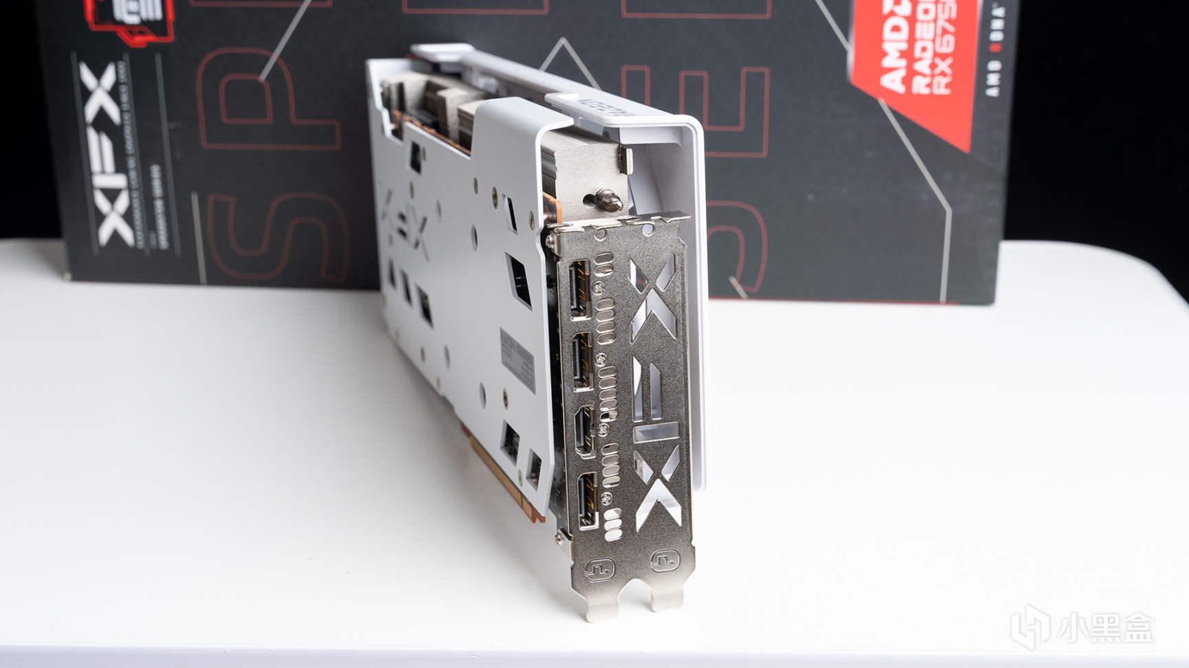从侧面就能观察到,RX 6750 GRE 10GB雪狼妥妥属于越肩式设计,视频接口就是采用DP1.4a*3+HDMI 2.1的常见组合。