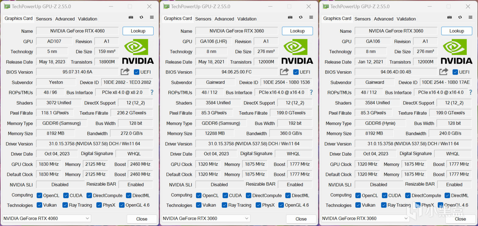 三款N卡分别是RTX 4060 8GB/RTX 3060 12GB/RTX 3060 8GB,GPU-Z参数如上,三者的Boost频率均属于公版设定包括最大功耗也是锁死的,而RTX 3060 12GB和RTX 3060 8GB的关系,就像本文这两款不同容量版本的GRE显卡一样,不单单是显存容量的不同,而这五款价格相邻的显卡放一起进行性能对比,显然就可以看出谁更值得买。