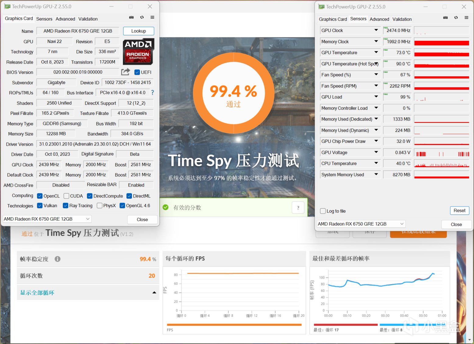 RX 6750 GRE 12GB EAGLE猎鹰在Time Spy压力测试中通过率为99.4%