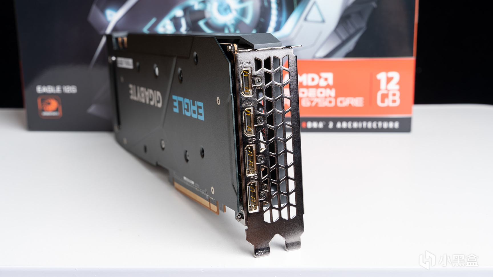 RX 6750 GRE 12GB EAGLE猎鹰就不属于越肩式的设计了,毕竟本身的三风扇散热器已经足够压制这颗230W的GPU,视频接口是DP1.4a*2+HDMI 2.1*2的组合,接口分配显然更为合理一些。