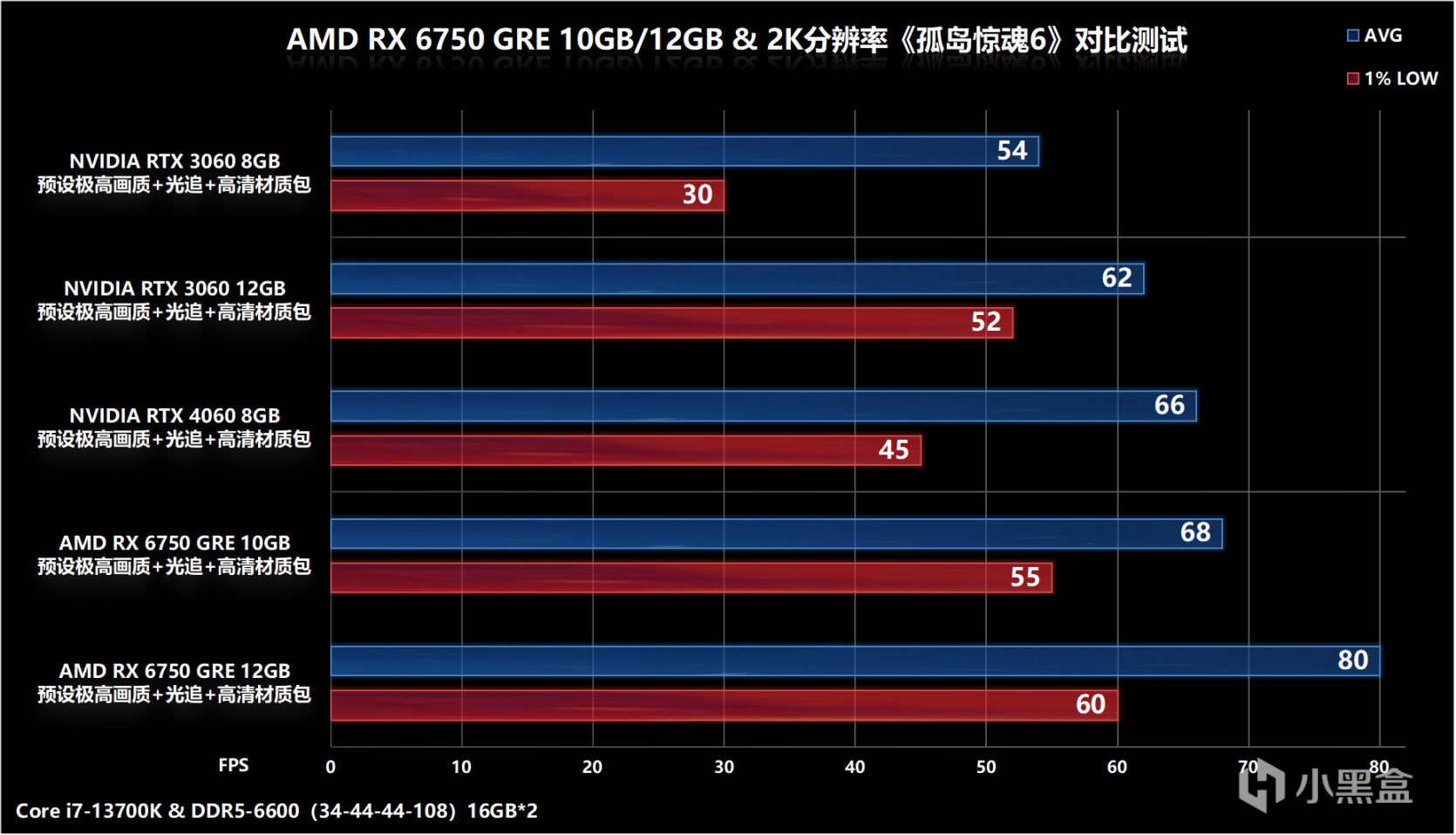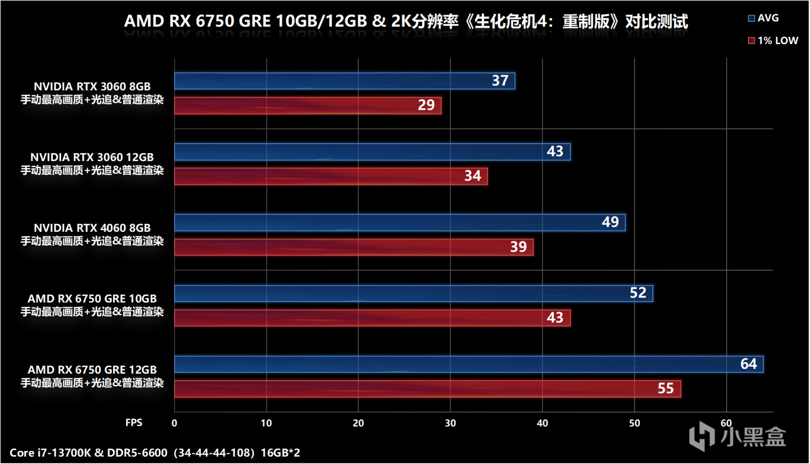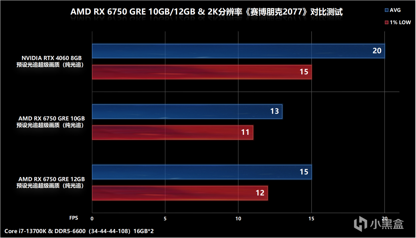 光线追踪方面,这里测试不开启任何FSR或者DLSS技术进行辅助,纯靠光追硬件去运行,对于光追集成度高的游戏,比如《赛博朋克2077》里就涵盖了各种光追特效,毕竟RTX 4060的光追硬件那是领先一代自然有优势,而在一些光追集成度不算很高的游戏中,RX 6750 GRE两款相对RTX 3060、RTX 4060都会有一些优势。