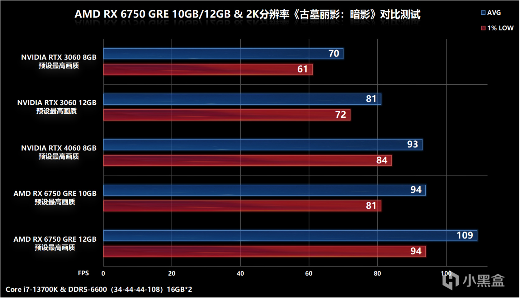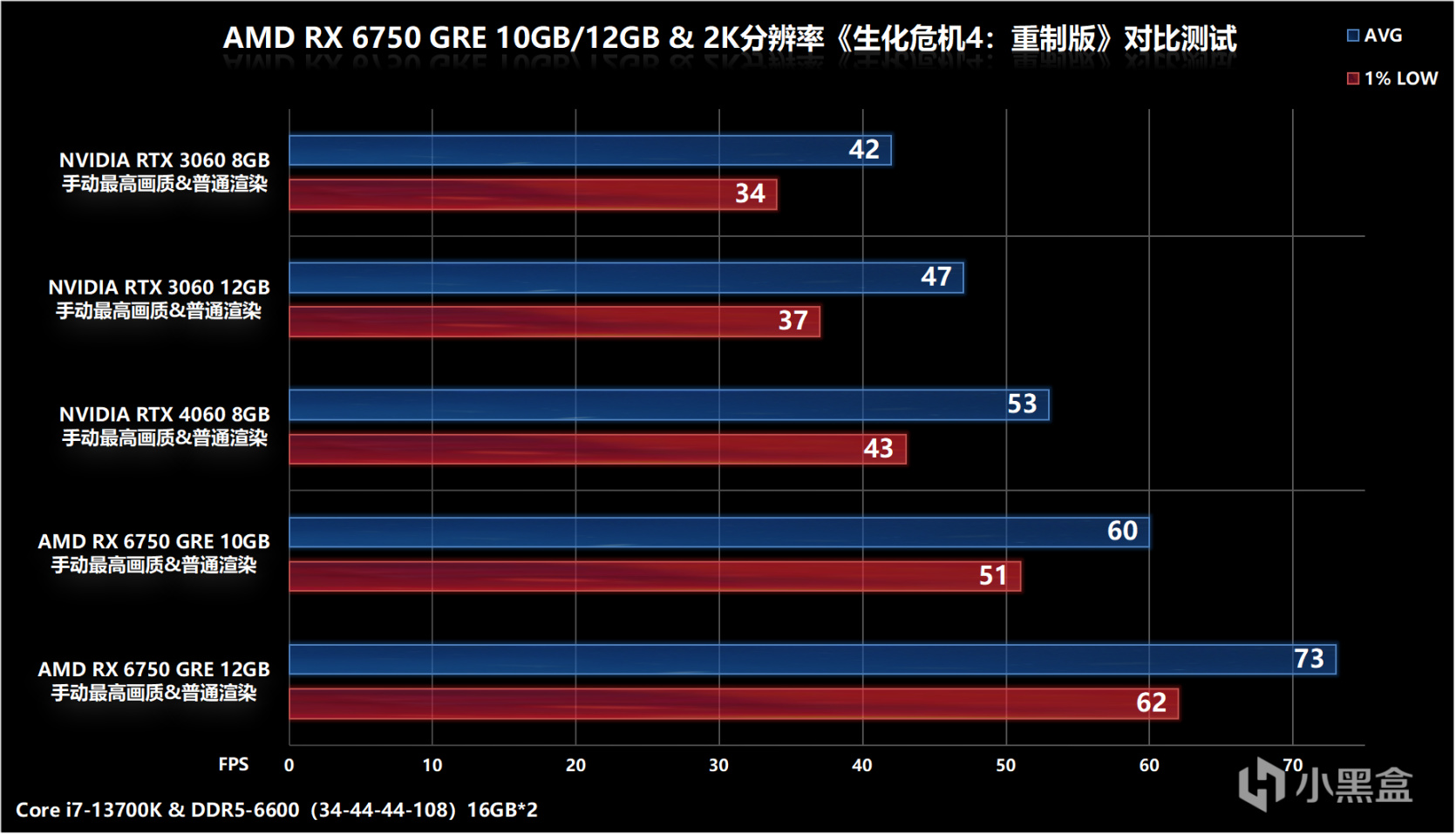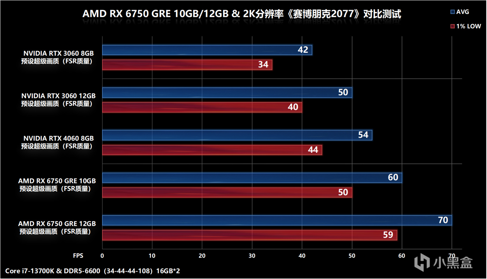 光线追踪方面,这里测试不开启任何FSR或者DLSS技术进行辅助,纯靠光追硬件去运行,对于光追集成度高的游戏,比如《赛博朋克2077》里就涵盖了各种光追特效,毕竟RTX 4060的光追硬件那是领先一代自然有优势,而在一些光追集成度不算很高的游戏中,RX 6750 GRE两款相对RTX 3060、RTX 4060都会有一些优势。