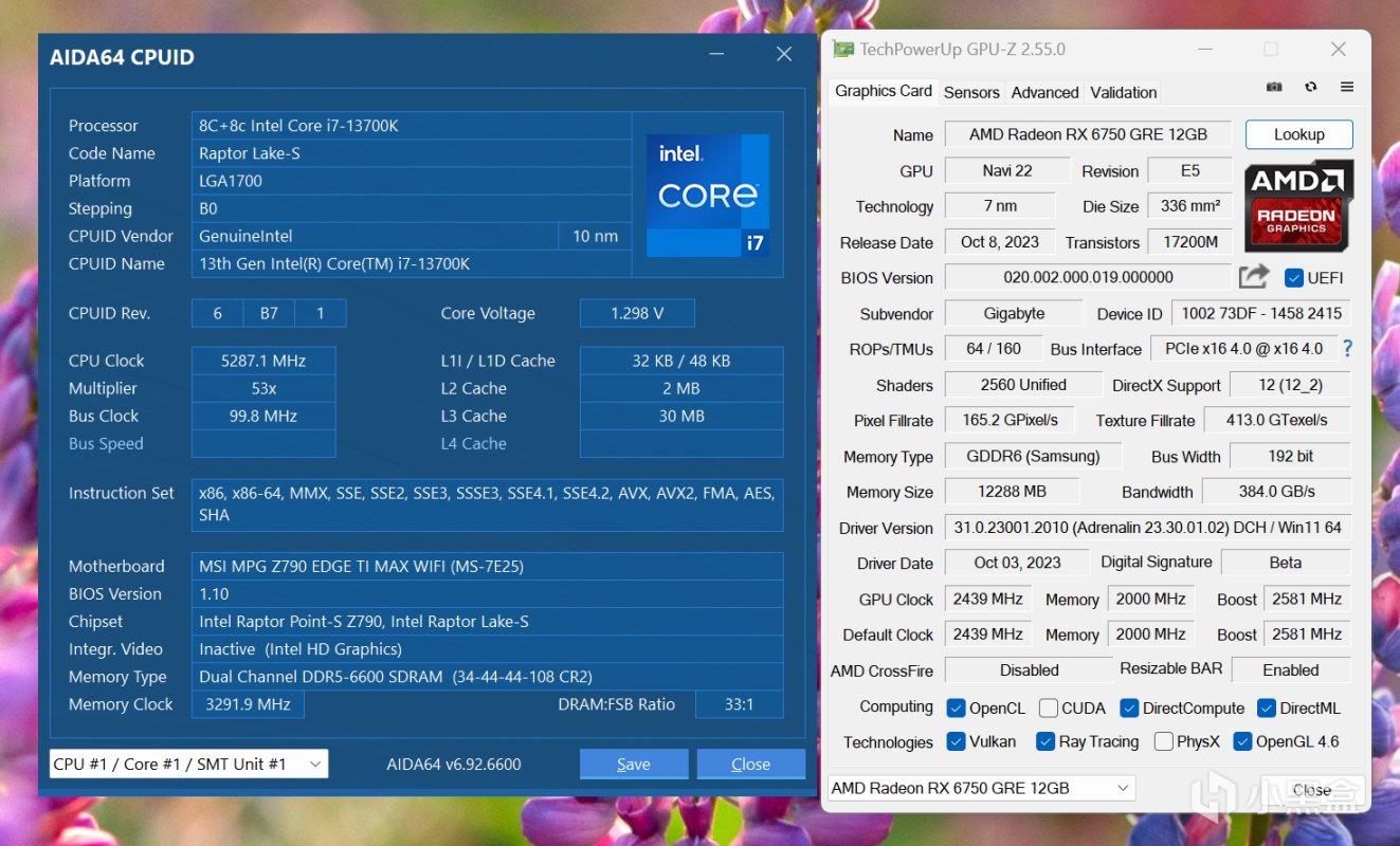 本次测试硬件和使用环境,CPU使用Intel Core i7-13700K,能最大程度降低CPU瓶颈,BIOS内开启DDR5 6600C34 XMP配置,操作系统是最新Windows 11 22H2,安装的是Adrenalin 23.30.01.02 DCH预览版本驱动,而NVIDIA驱动属于537.58 WHQL最新的正式版本,两款驱动测试时均为默认设置。