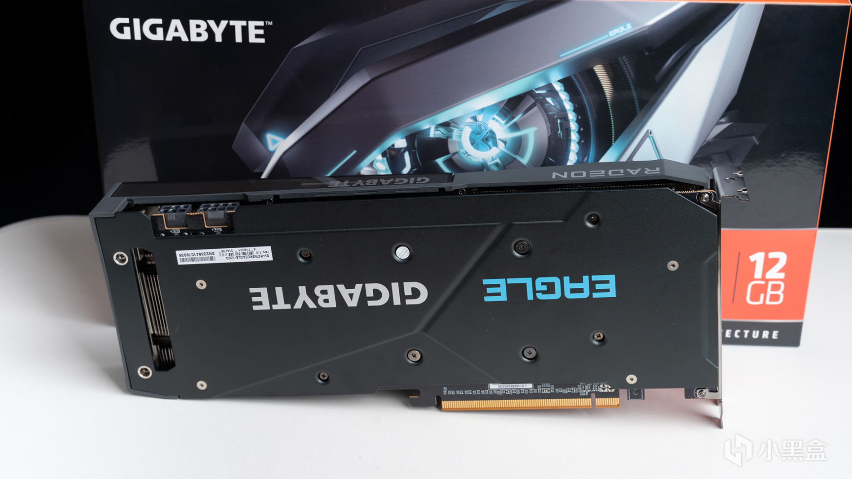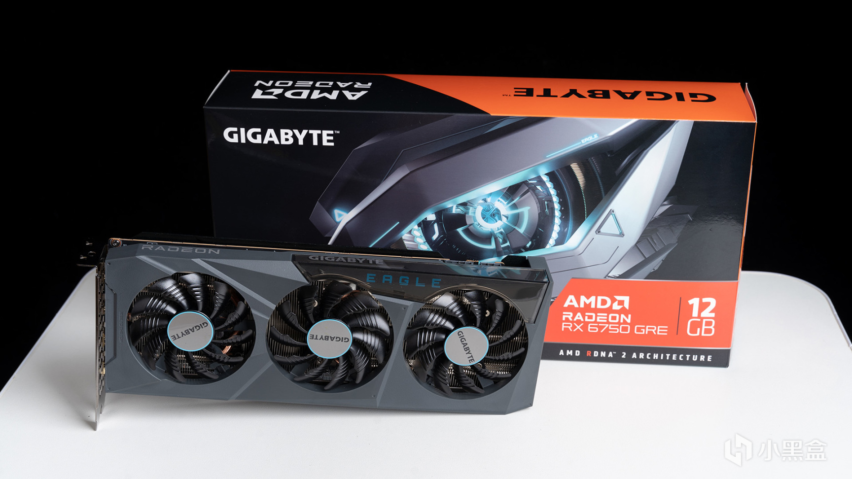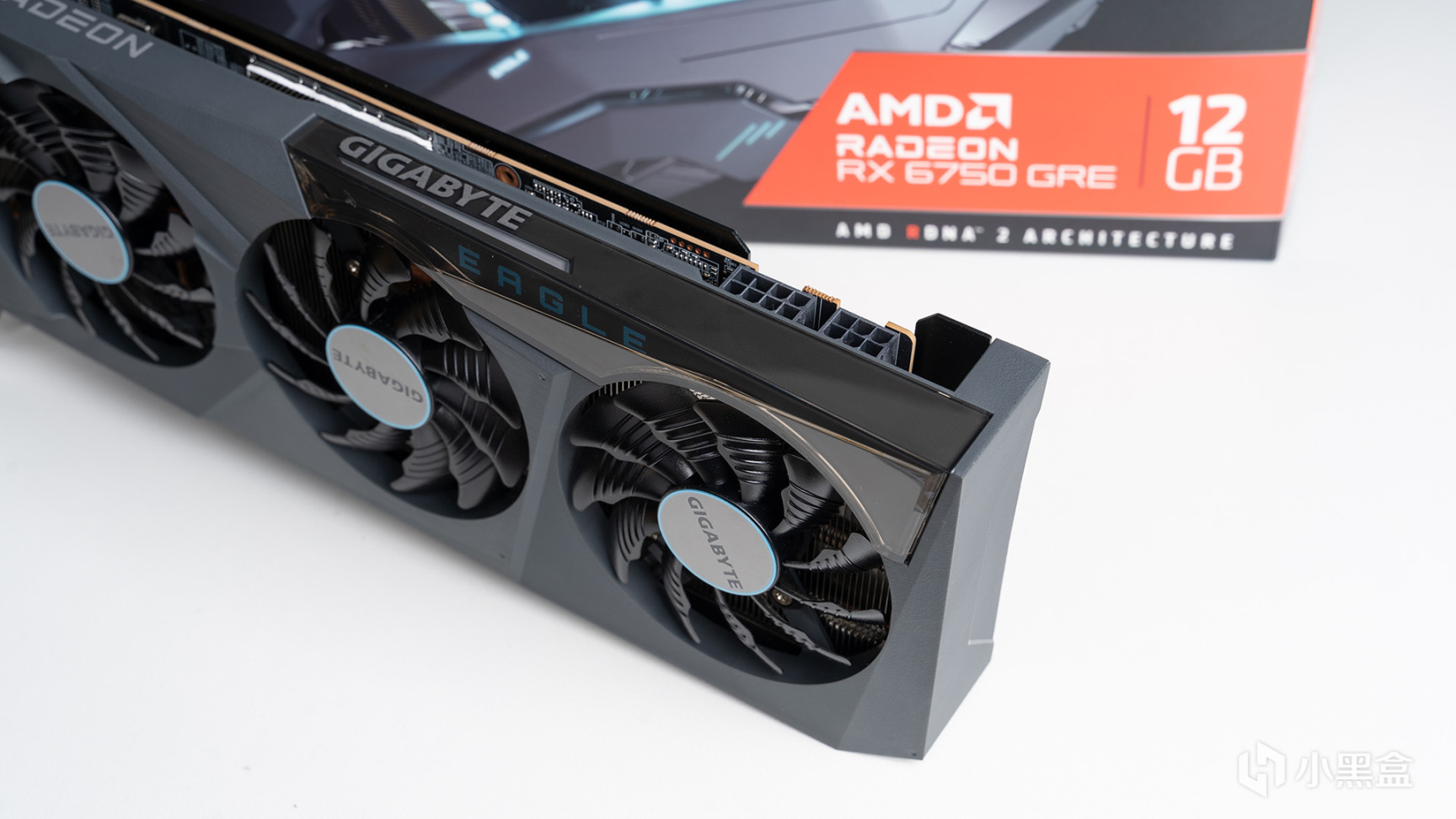 另一款就是来自技嘉的RX 6750 GRE 12GB EAGLE猎鹰,由于采用三风扇设计,整体造型更为修长,和之前的RX 67XX型号同属一个散热器,整体长度也达到了280mm,外观属于经典的风之力散热系统营造。