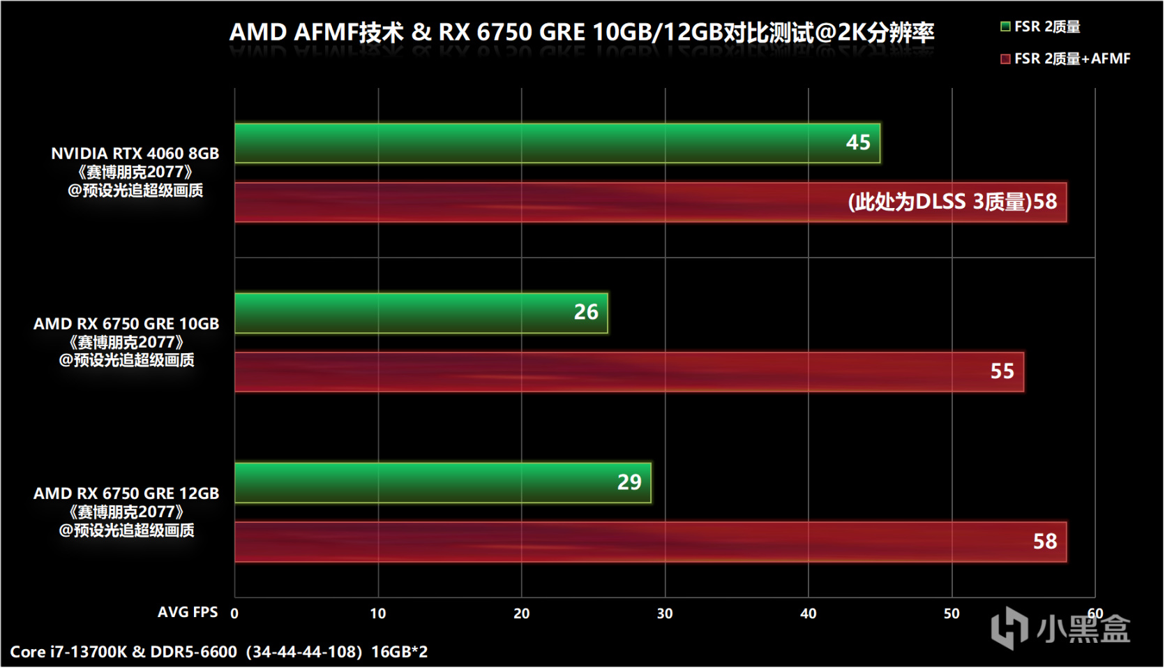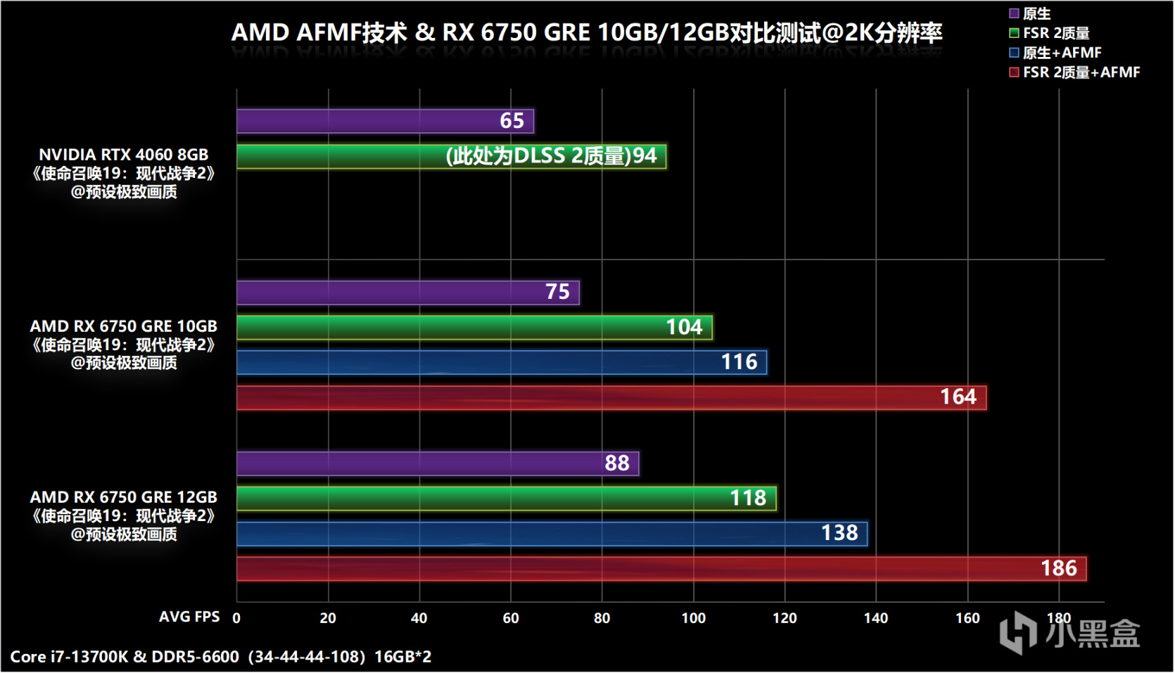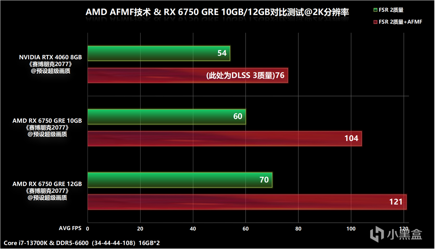 最后,AFMF技术在一些没有DLSS 3加持的游戏中也有性能优势,因为它是通过驱动层面实现的,大部分游戏都能兼容支持,就以上案例来看,RTX 4060通过DLSS 2将帧数提升到94fps,而RX 6750 GRE 10GB和12GB则可以通过FSR 2质量+AFMF技术双重叠加使用,达到FSR 3.0的提升幅度,帧数直接变成了高刷水平,根本就不是一个层次了。