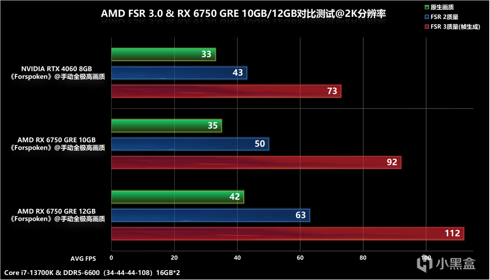 就拿《Forspoken》来说,FSR 3.0的帧生成技术能给RX 6750 GRE系列显卡带来更高的性能提升,而RTX 4060也是能用FSR 3.0,只不过提升幅度就没那大,并且画面的适配性就要差一点了,同样FSR 2.0也是同样的道理。