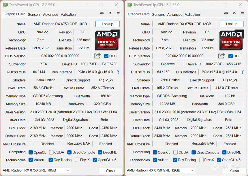 RX 6750 GRE 10GB和RX 6750 GRE 12GB的GPU-Z参数,本来就是Navi 22核心的产物,不需要安装最新版本就能识别出来的,两款显卡的显存颗粒均来自三星,测试时均开启Resizable BAR(SAM)技术再提升一些显卡性能。