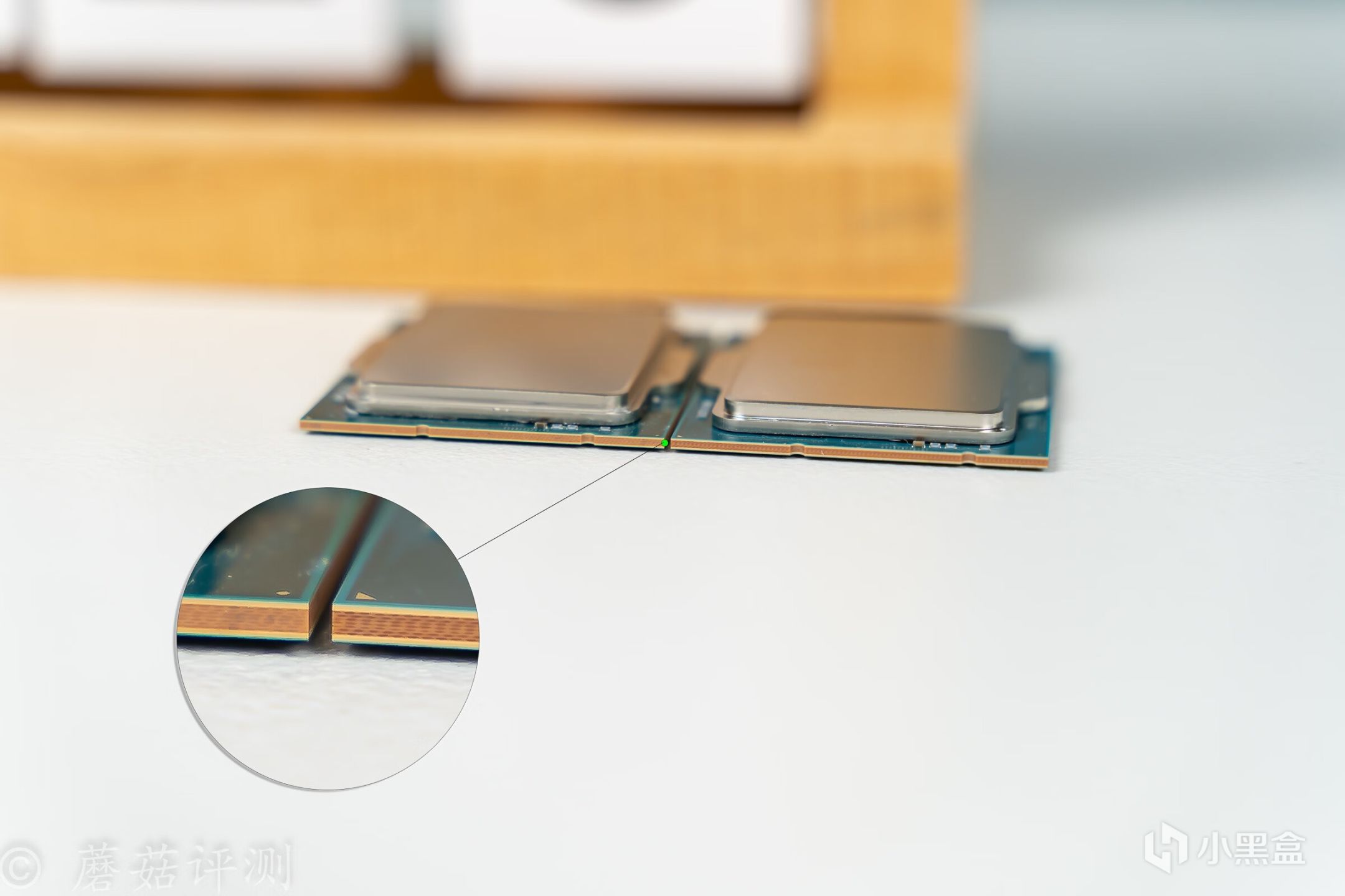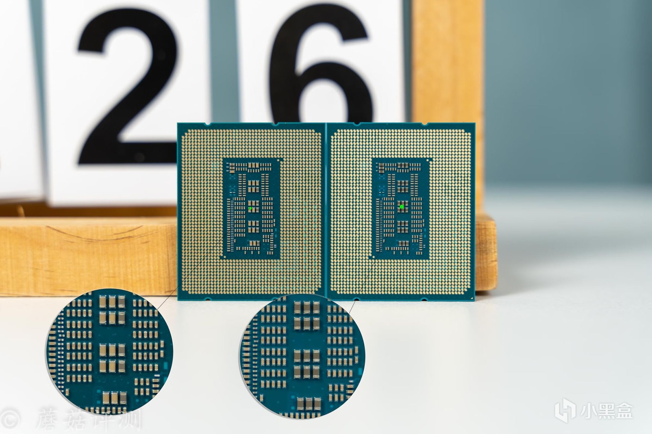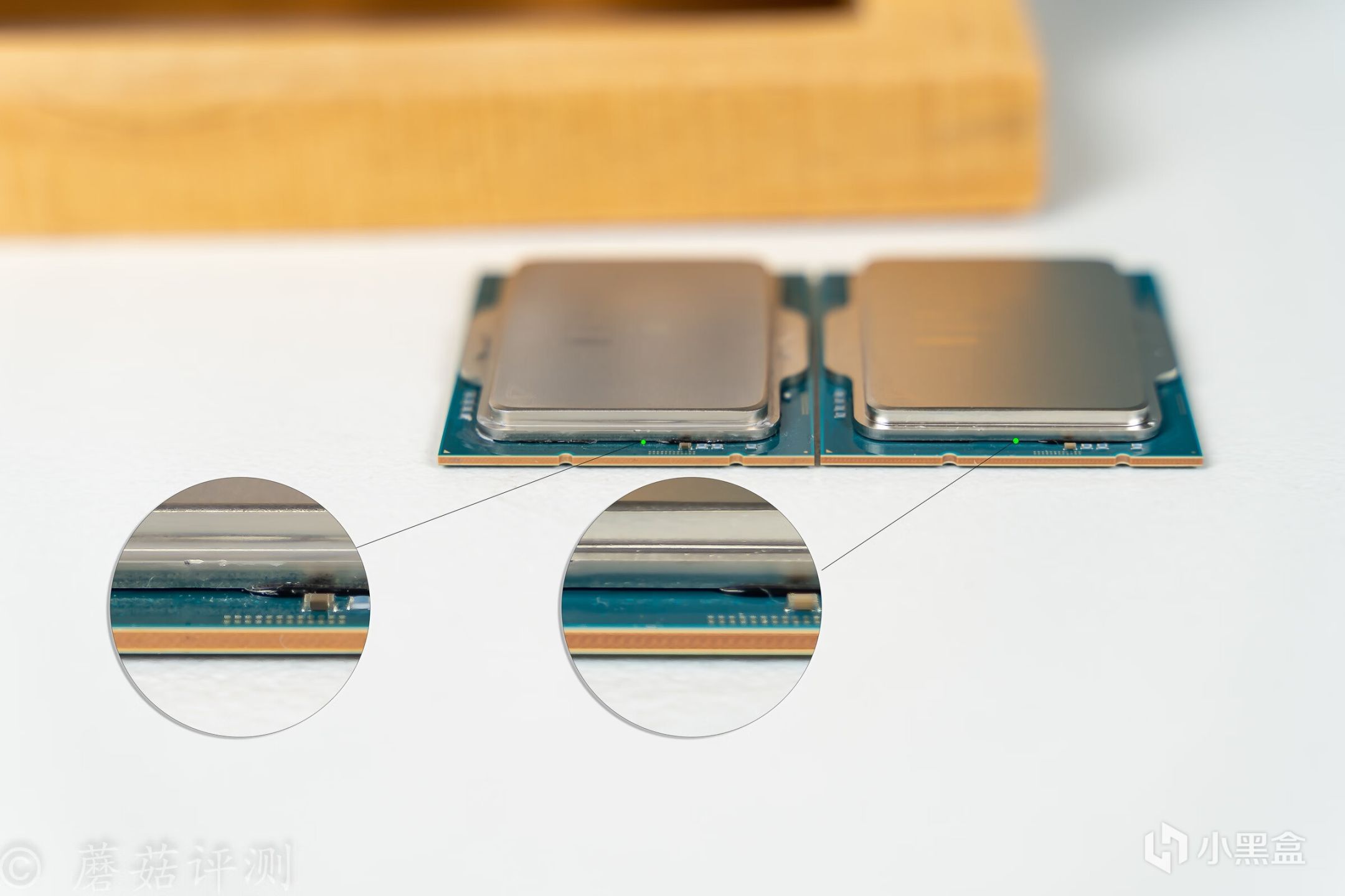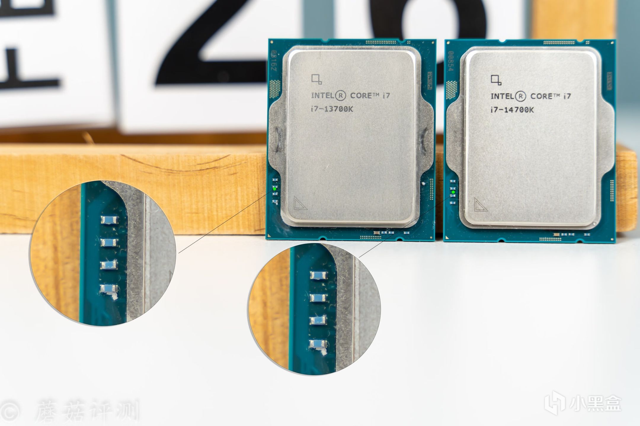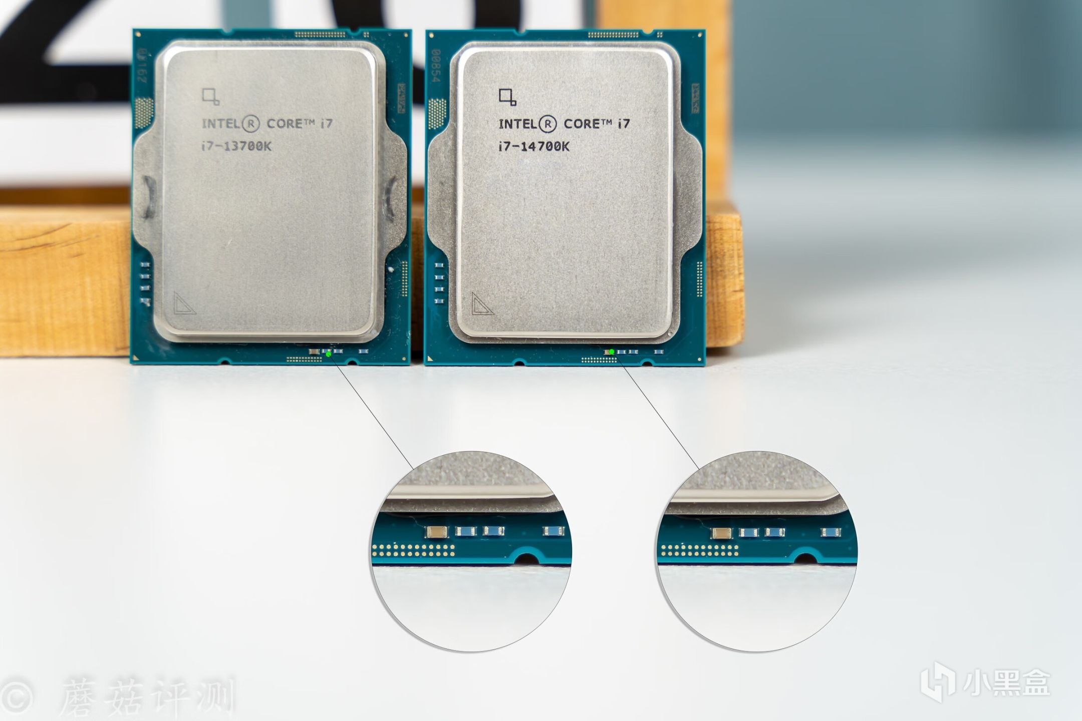 ▼最后在蘑菇的超仔细观察之后,终于发现了一丢丢的不同,处理器后面贴片陶瓷电容的部分颜色不同。13700K的中间的贴片电容是左侧两列颜色要浅一些,右侧一列,颜色深一些,而14700K处理器中间的贴片电容都是深色的,可能在电容的一些型号、参数方面略有不同。