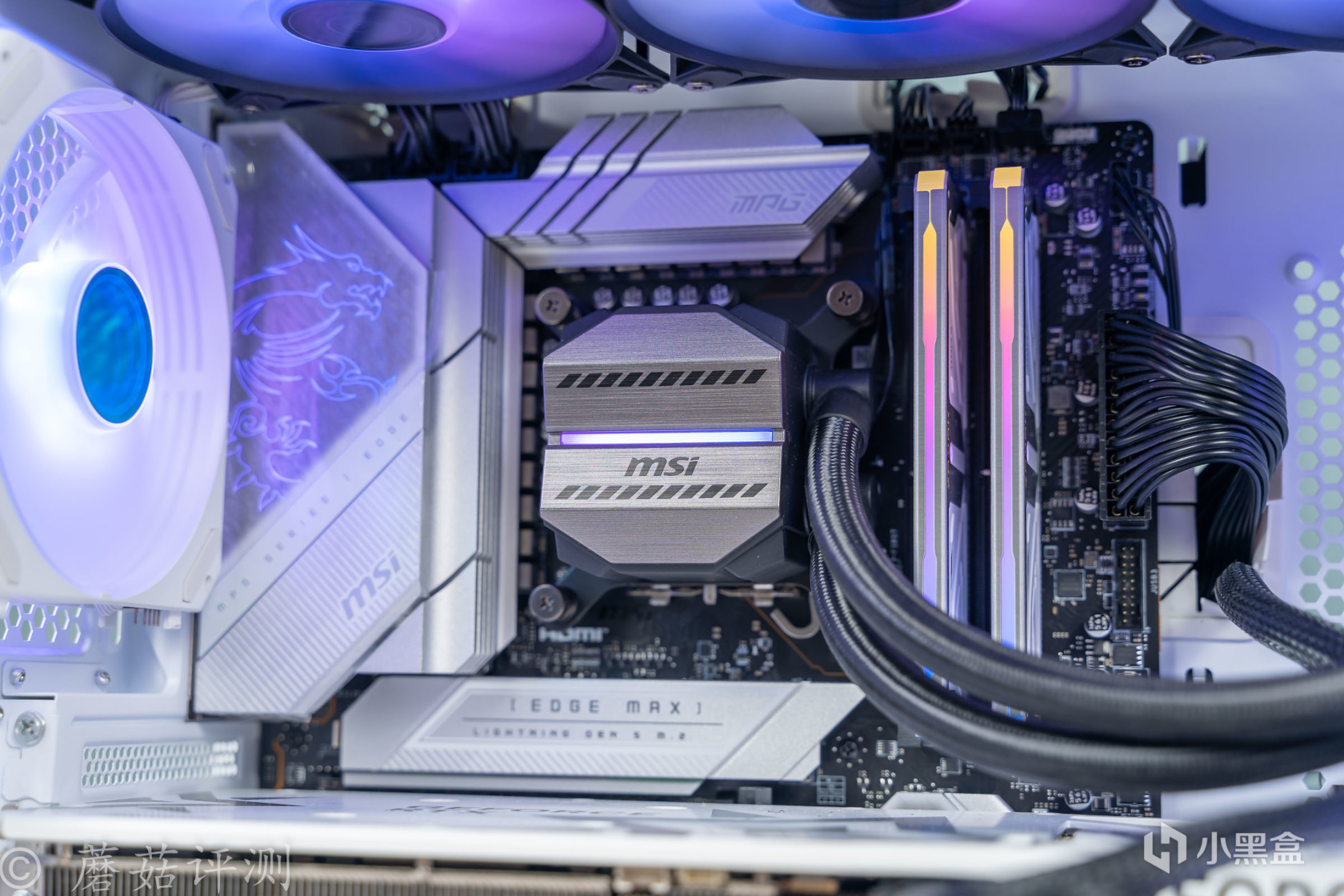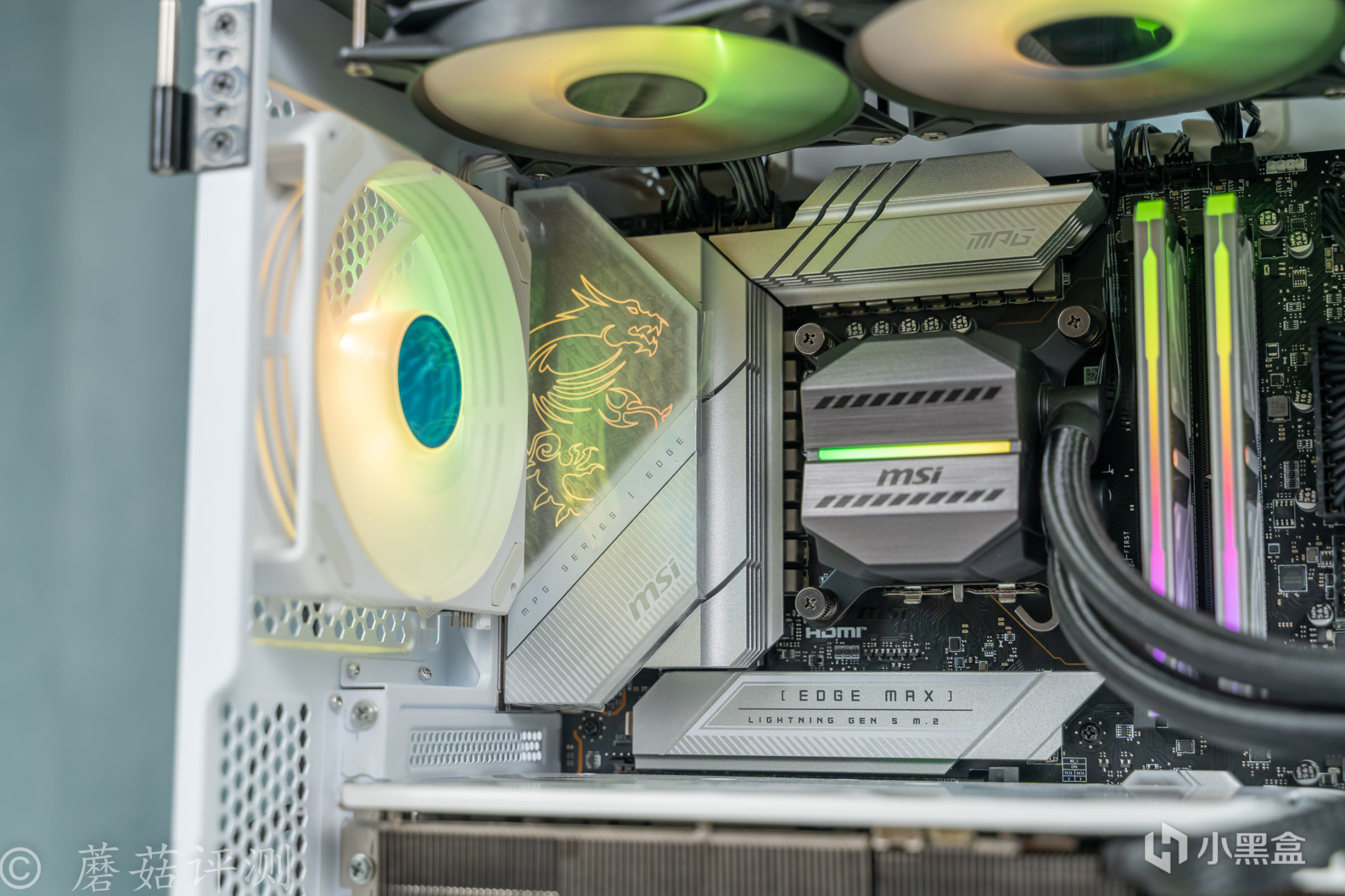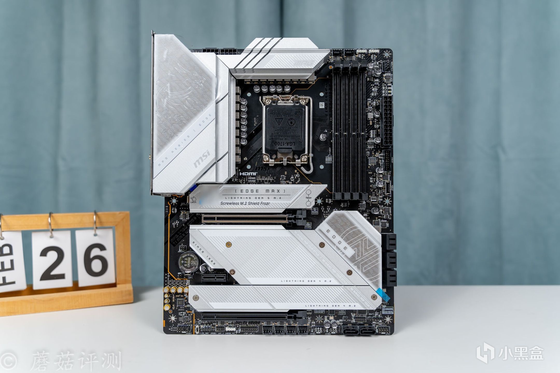 ▼搭配的主板是微星的Z790刀锋钛MAX,这块主板正面覆盖有大量的银色金属件,颜值很漂亮,并且能辅助各部分硬件散热。