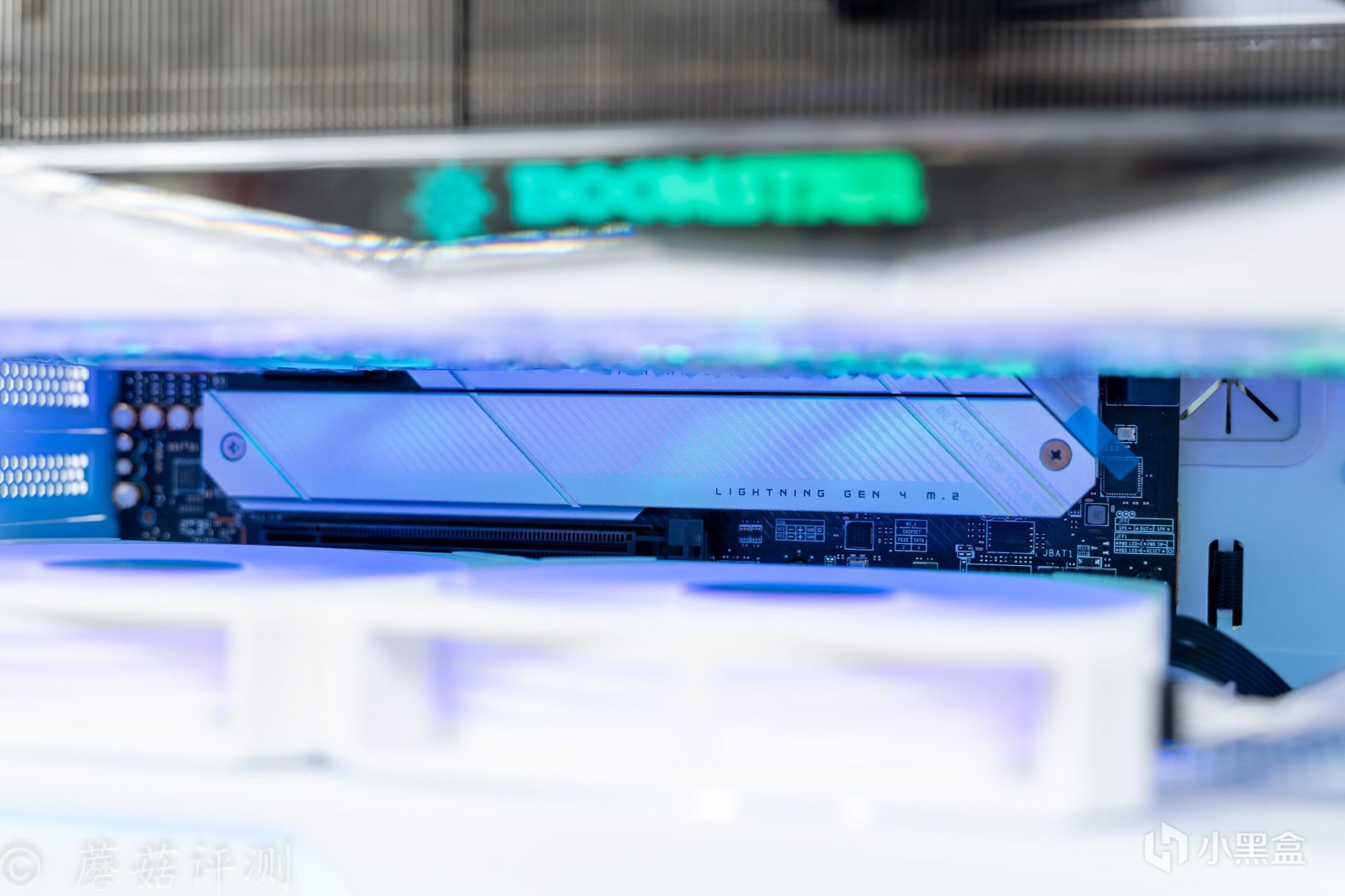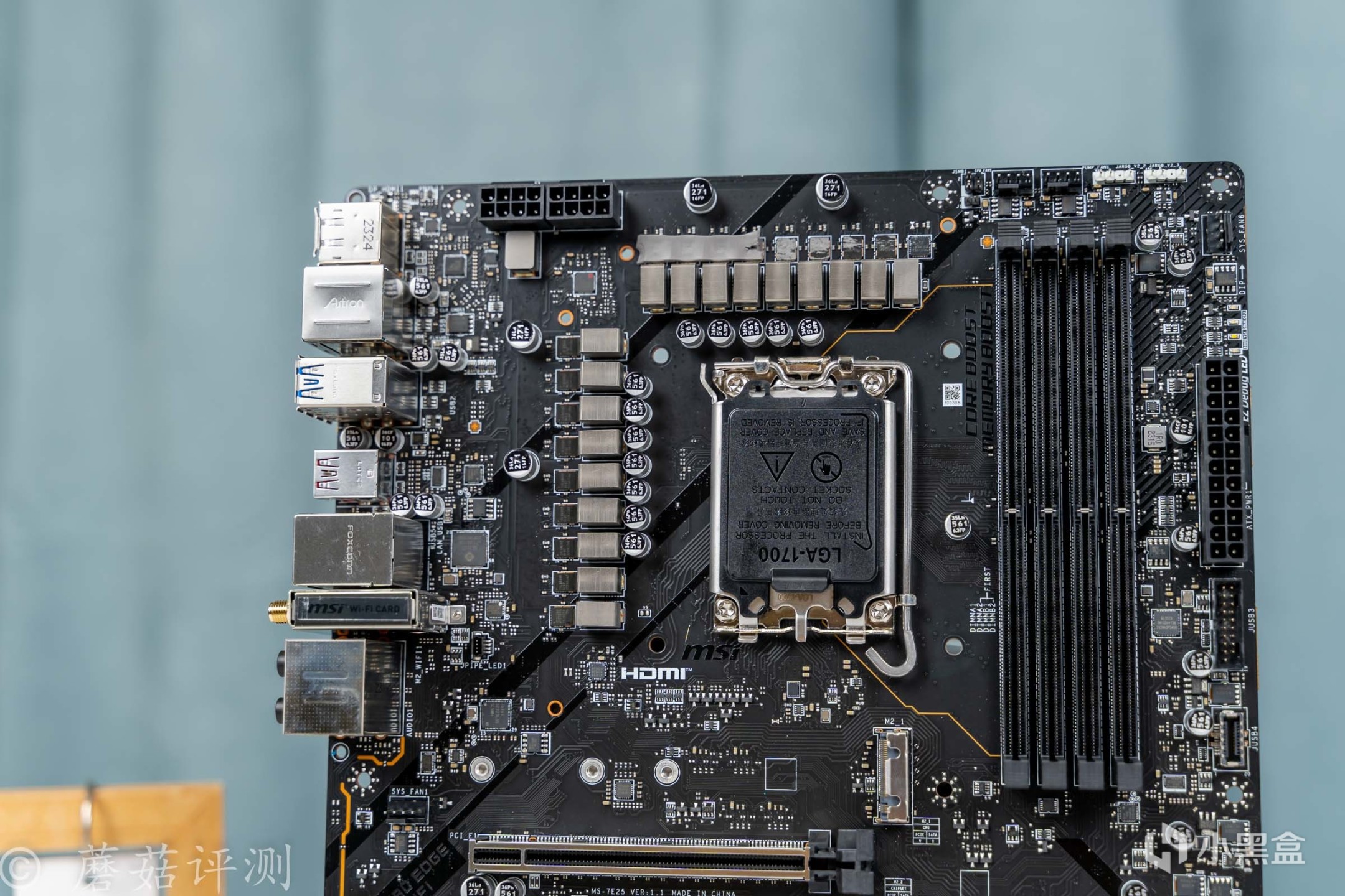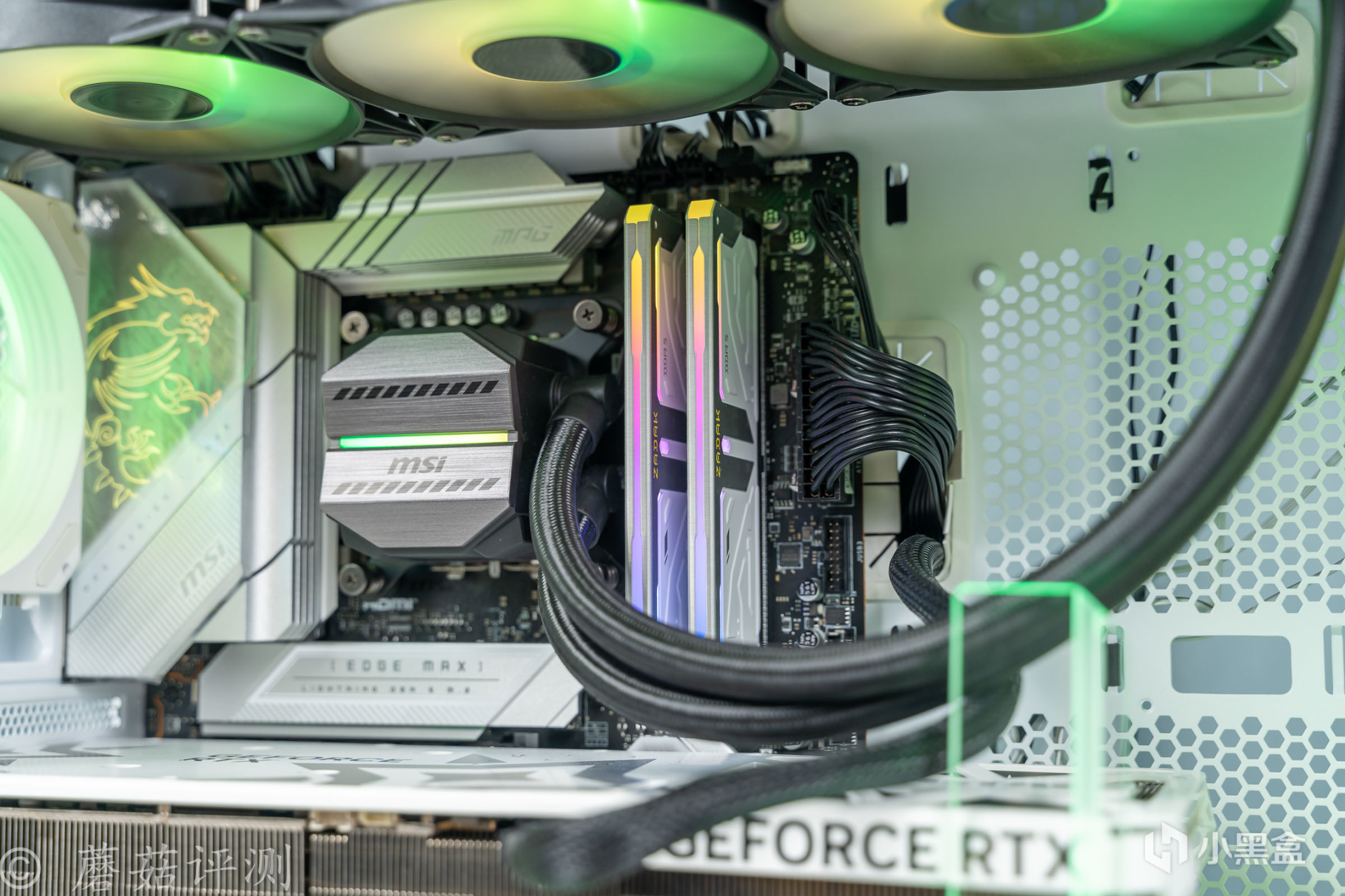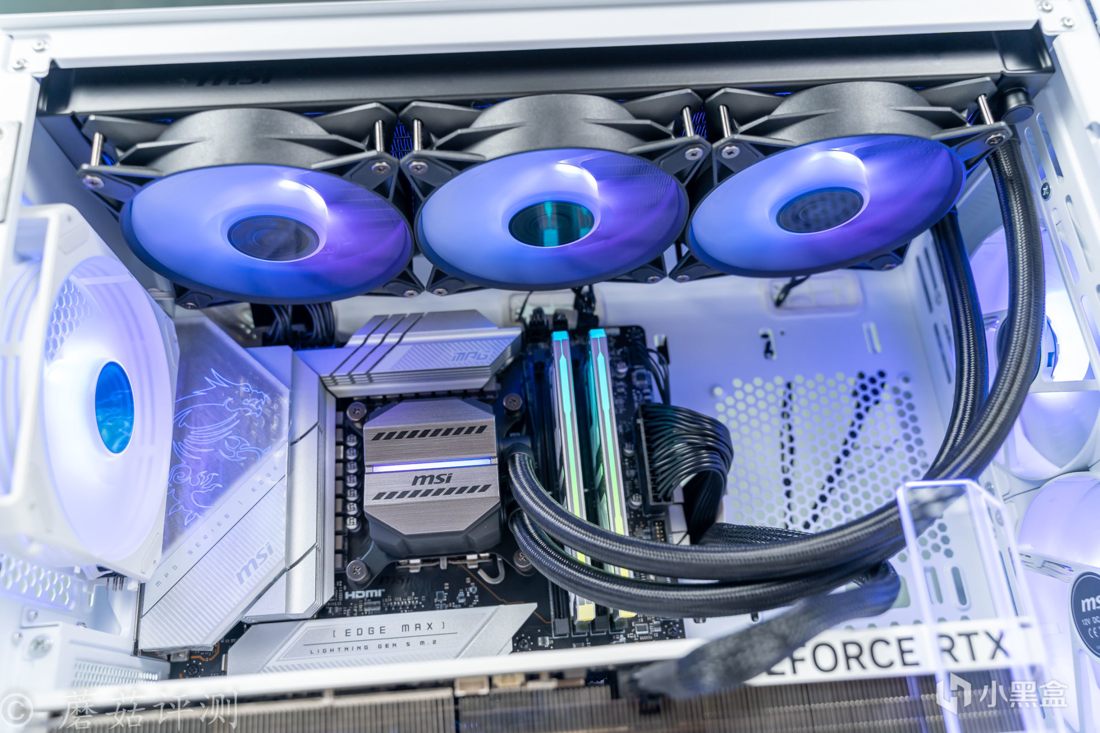 ▼搭配的主板是微星的Z790刀锋钛MAX,这块主板正面覆盖有大量的银色金属件,颜值很漂亮,并且能辅助各部分硬件散热。