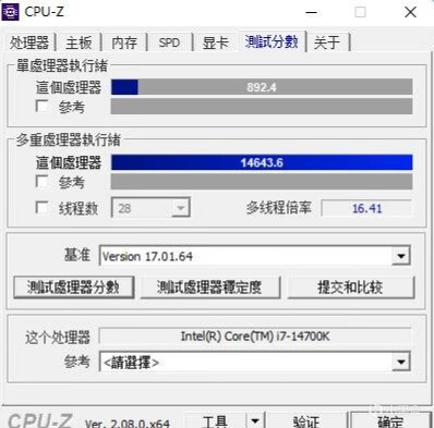 ▼简单跑个CPU-Z的测试,单核得分892.4、多核得分14643.6,不错不错。