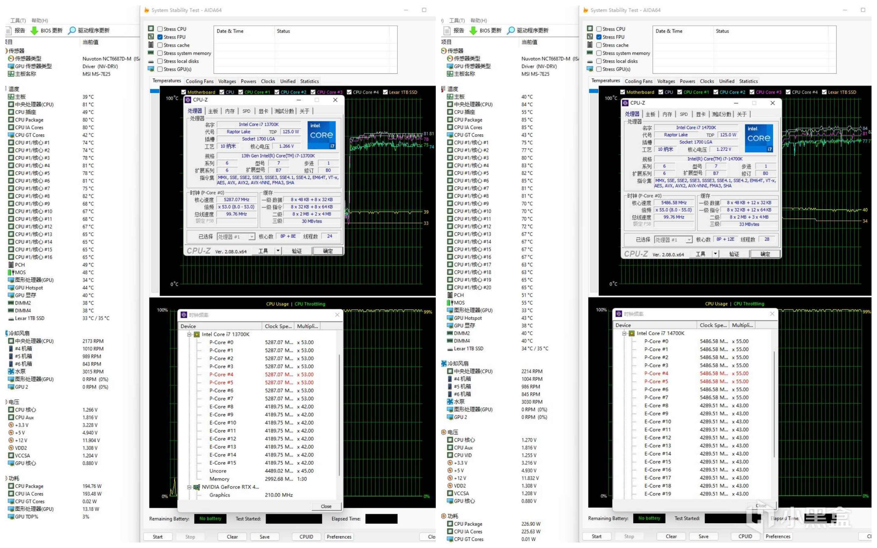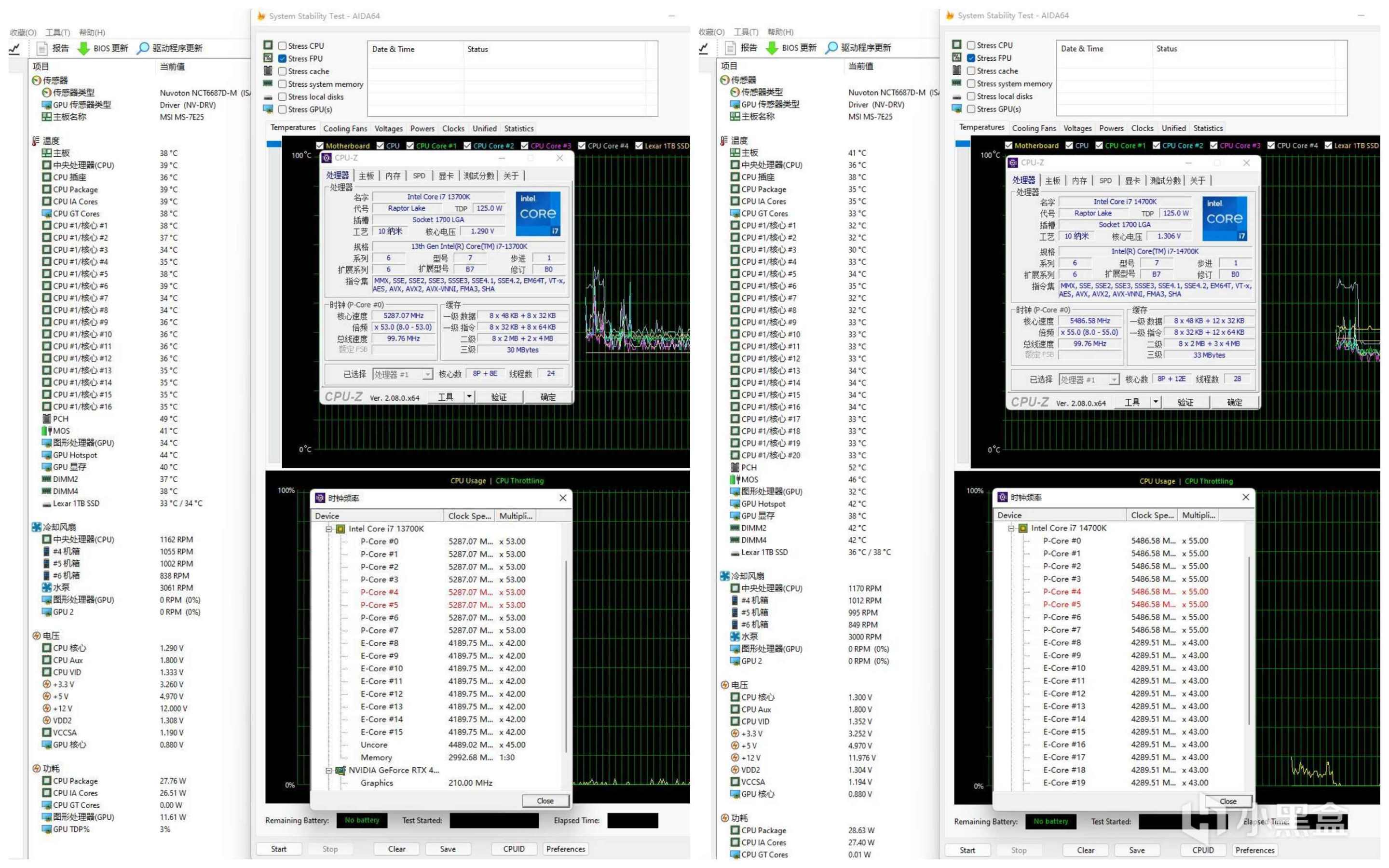 ▼简单跑个CPU-Z的压力测试,13700K处理器功耗195W左右,大核心睿频5.3GHz、小核心睿频4.2GHz,温度81℃;14700K处理器功耗在230W左右,大核心睿频5.5GHz、小核心睿频4.3GHz,温度84℃。