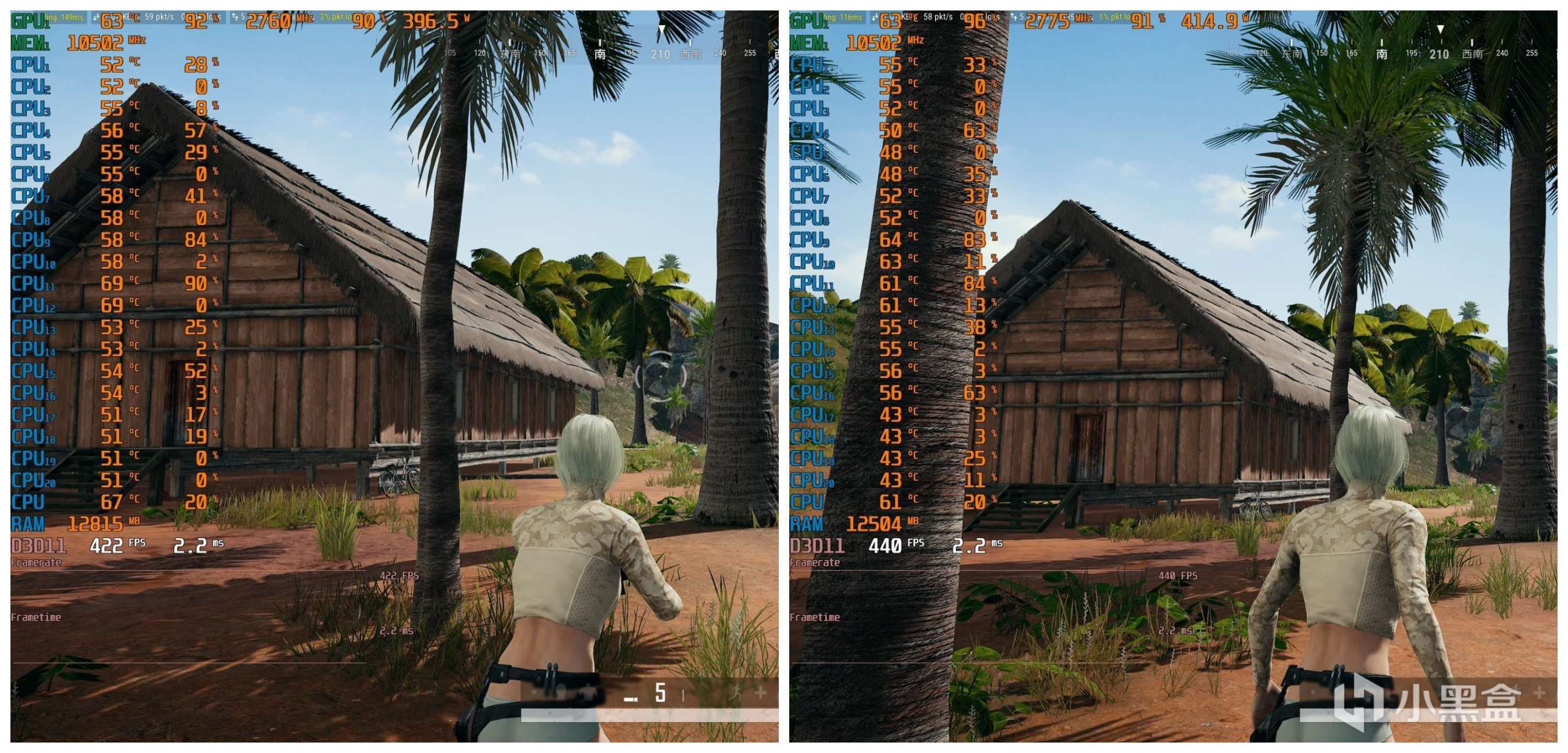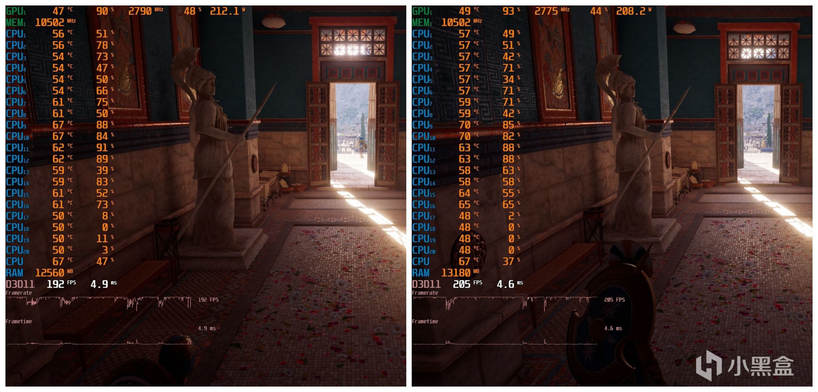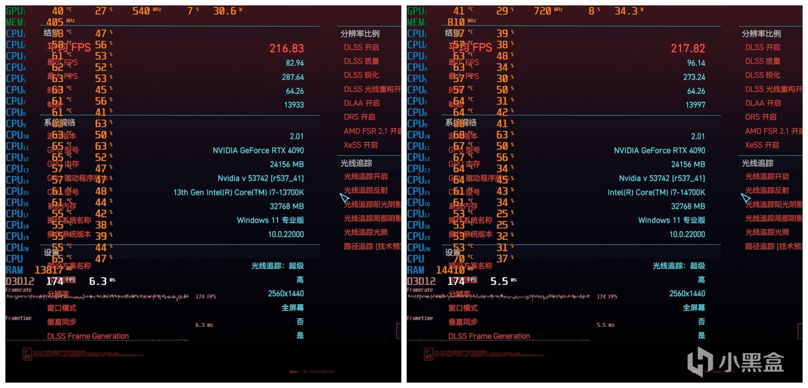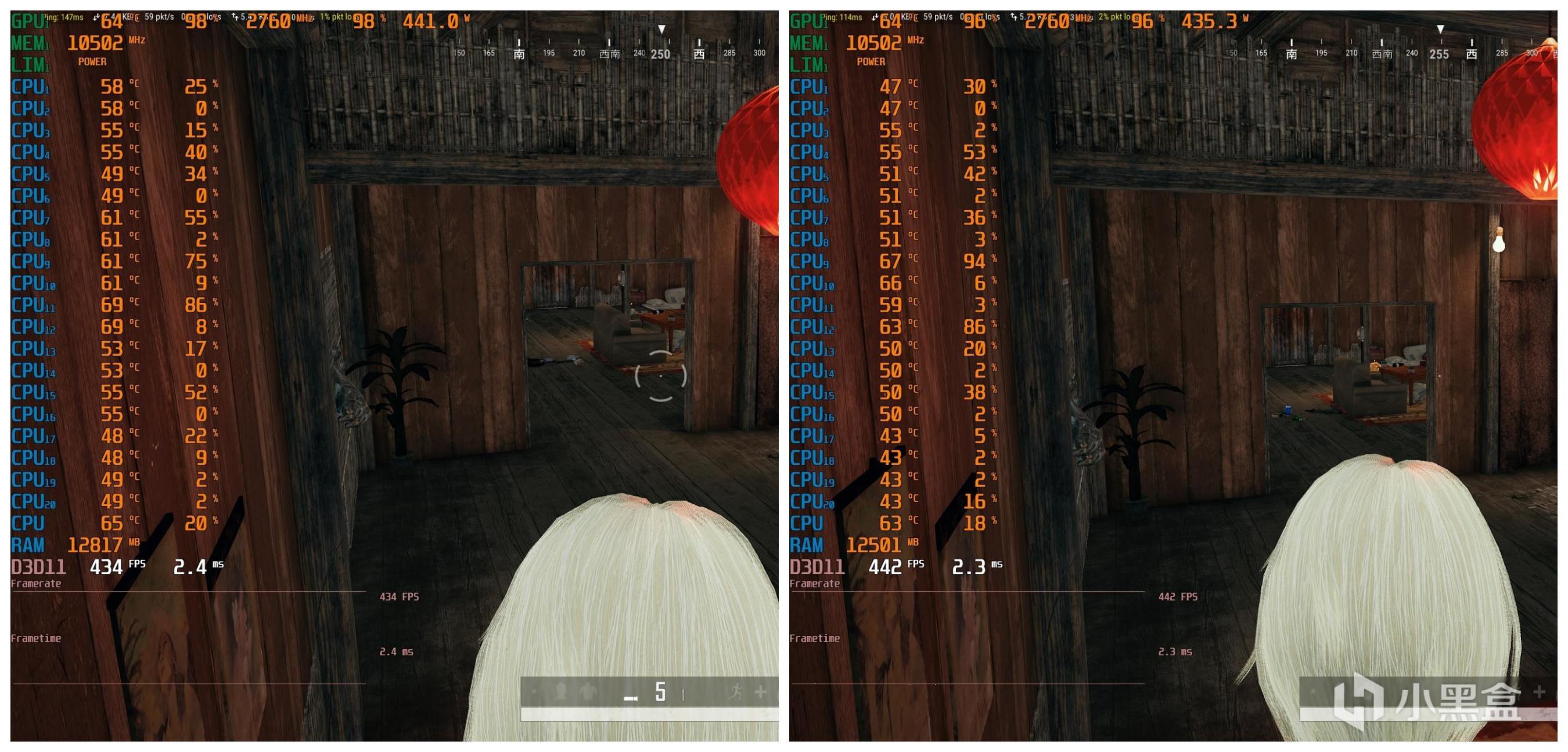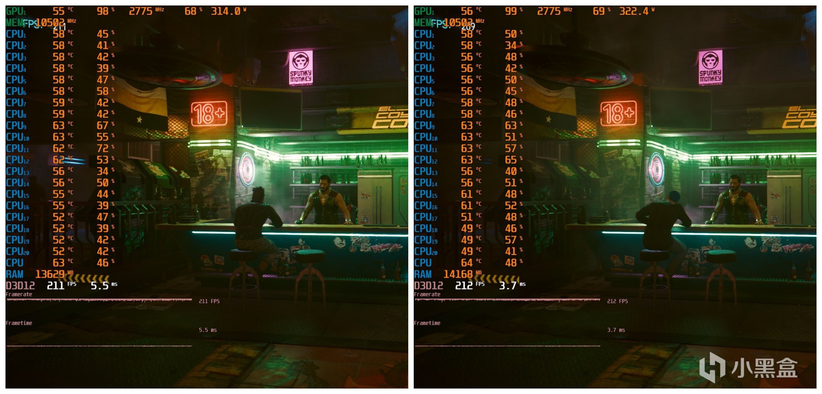 ▼吧台游戏帧数,14700K处理器略高1帧,显卡占用略高1个百分点。