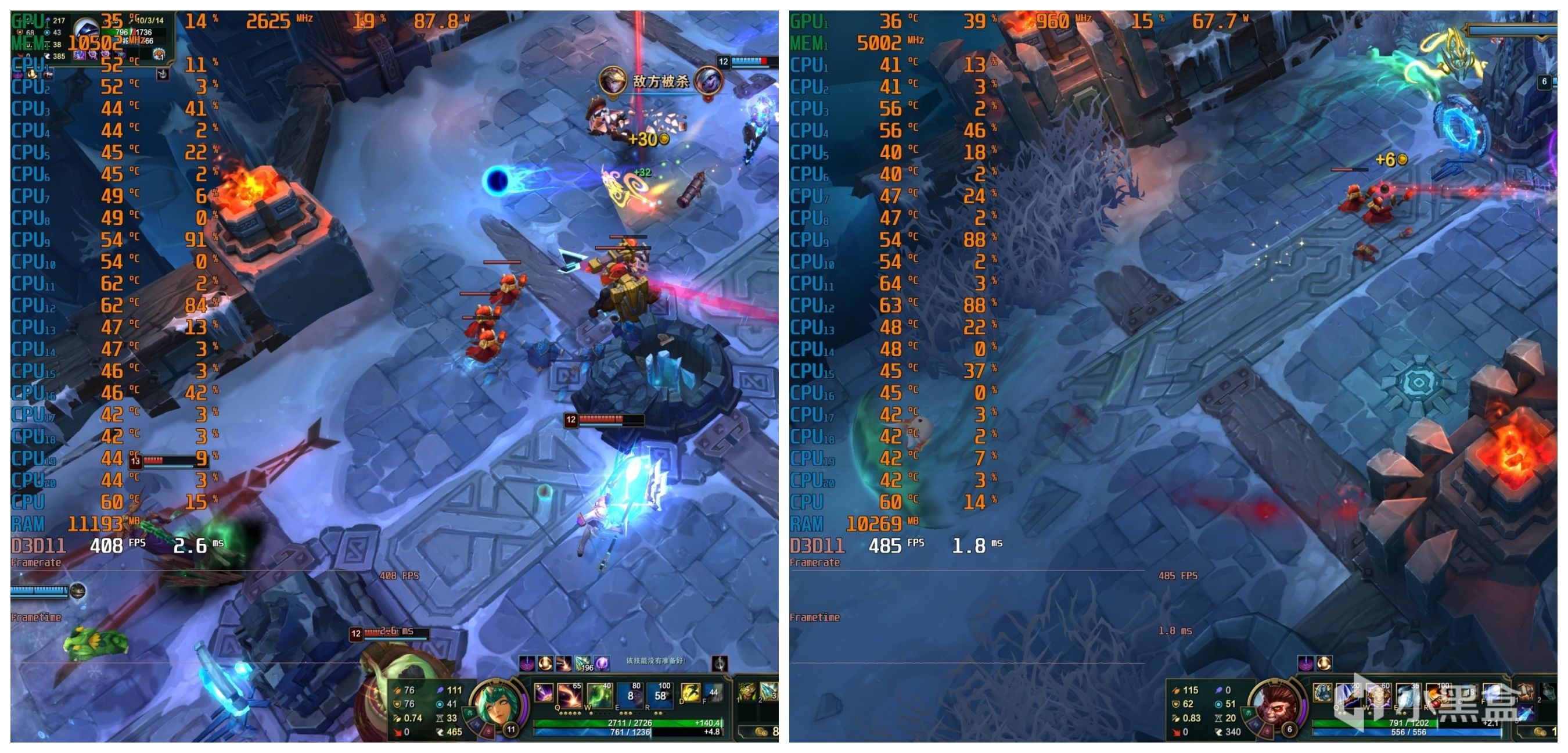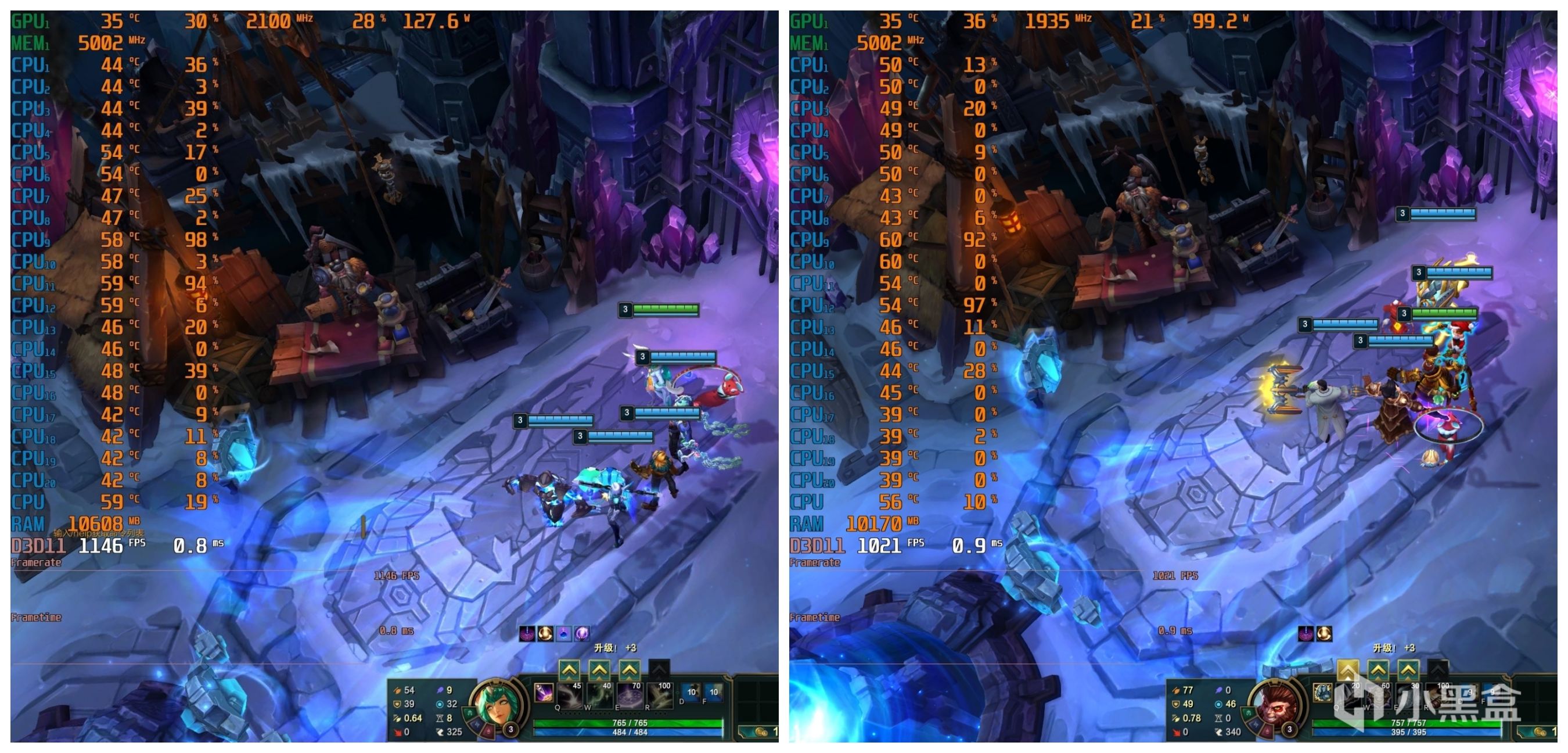 ▼游戏实测,LOL大乱斗模式,2K分辨率,全极高画质,泉水游戏帧数基本都能保持在1000+,不过14700K处理器的显卡占用会略高一点。