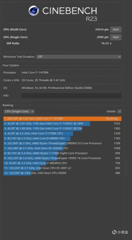 ▼跑个CineBench R23,单线程得分2090,多线程得分34554,非常不错的成绩。