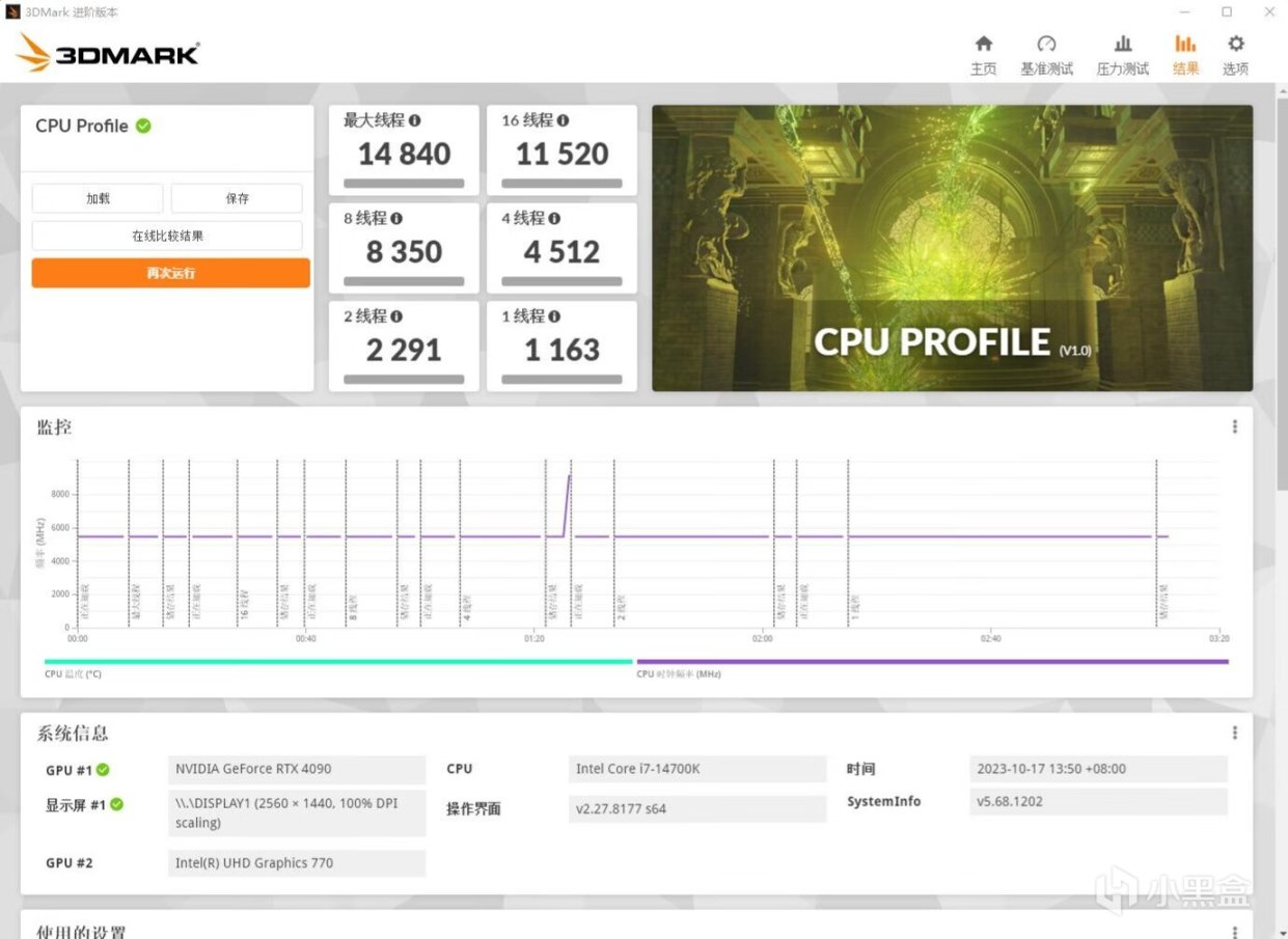 ▼简单跑个3Dmark的CPU测试,1线程得分1163,最大线程得分14840。