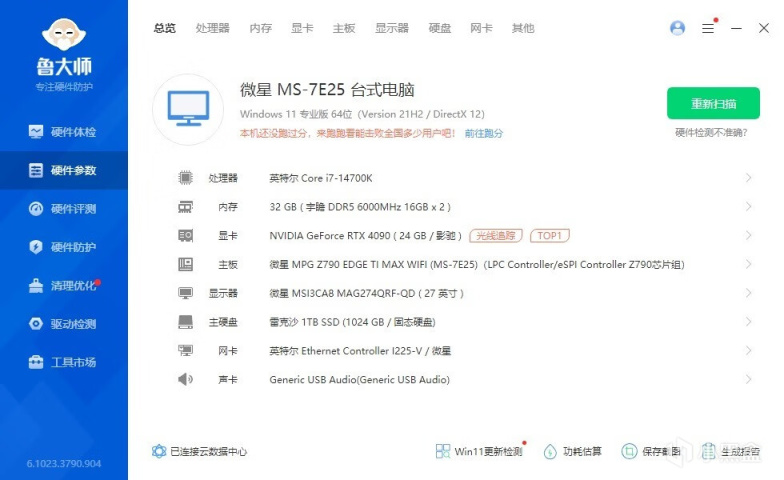 ▼简单看下整机配置,处理器是14700K,主板是微星的Z790刀锋MAX,显卡是影驰的RTX4090星耀OC。
