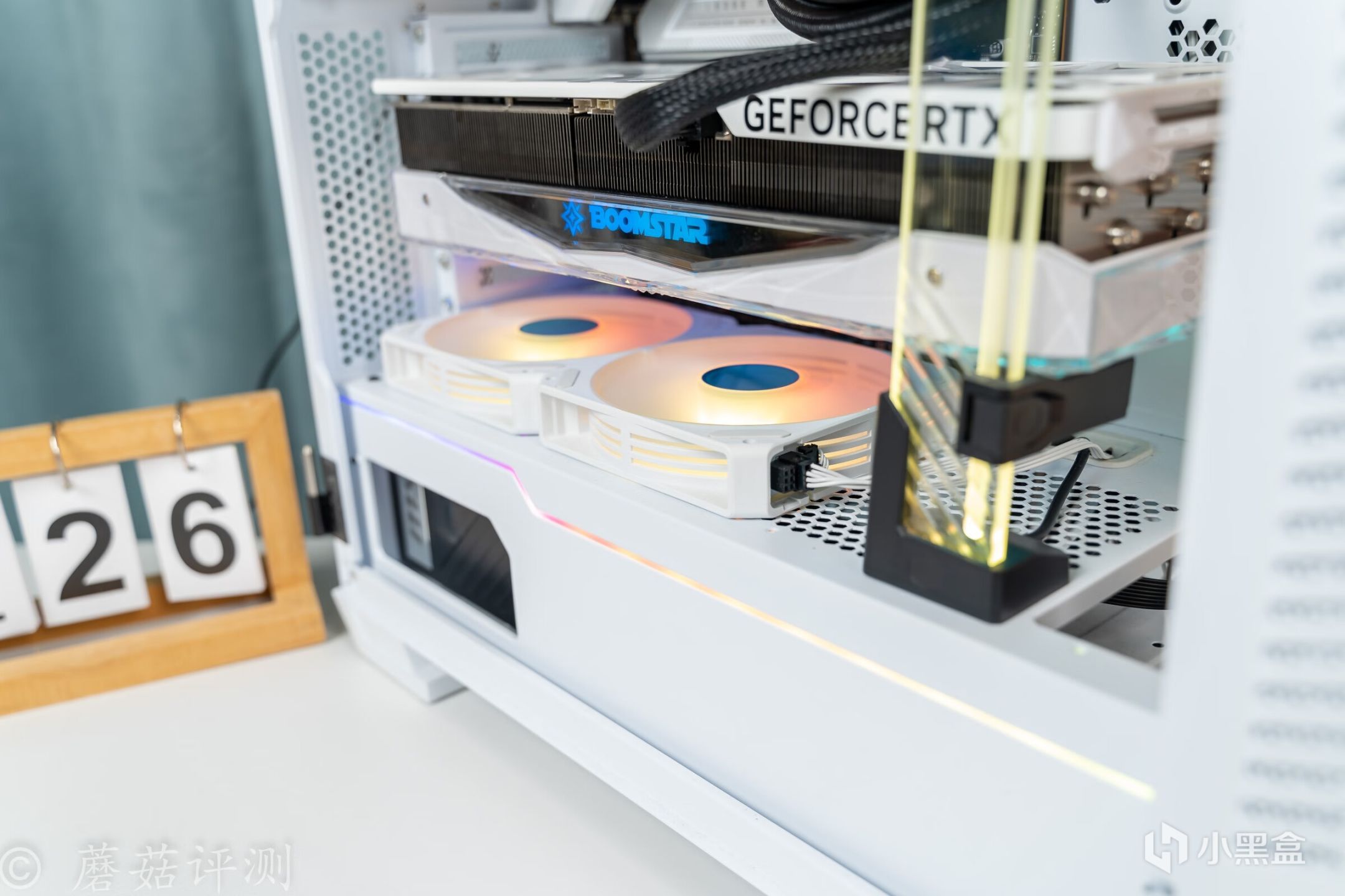▼机箱底部是独立的电源仓,顶部标配有机箱风扇位,可以在这里安装机箱风扇,专门照顾显卡部分的散热。