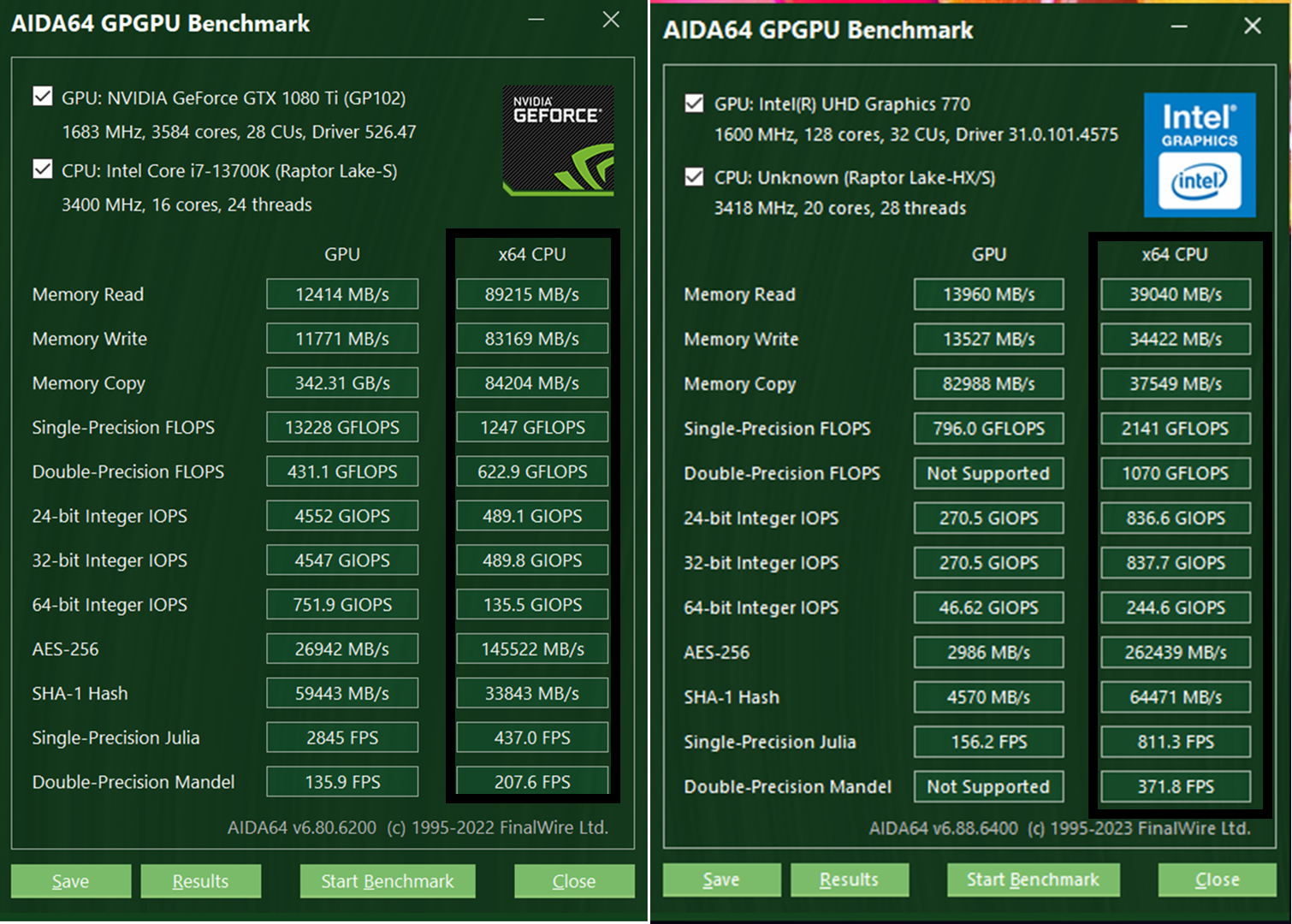 上AIDA64跑了一下benchmark,在同样都是七彩虹Z790的前提下,单精度算力部分,i7-13700K是1247GFlops,i7-14700K是2141GFlops,提升幅度71%;双精度算力部分i7-13700K是622.9GFlops,i7-14700K是1070GFlops,提升幅度71%;24位整数运算部分,i7-13700K是489.1GFlops,i7-14700K是836.6GFlops,提升幅度71%;32位整数运算部分提升幅度是71%;64位整数运算部分提升幅度80%;i7-14700K的AES-256加解密性能提升80%,SHA-1 Hash校验性能提升90%。
