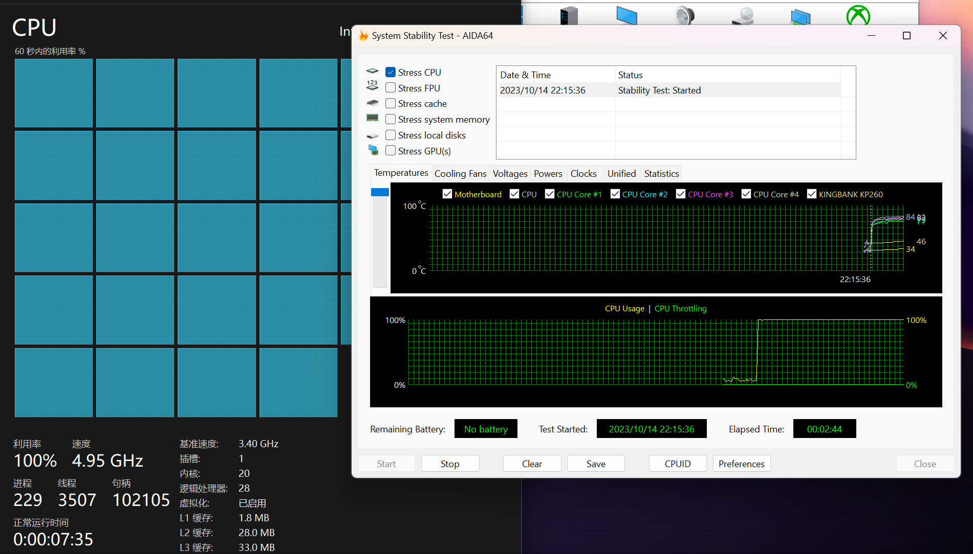 这个是我上双塔风冷烤机之后的温度,i7-14700K双塔风冷烤的话温度能稳定在84度,相对于水冷来说高了4度,并且风冷风扇的满载情况是噪声特别大,所以有条件的老哥还是老老实实上360水冷压一下它吧。
