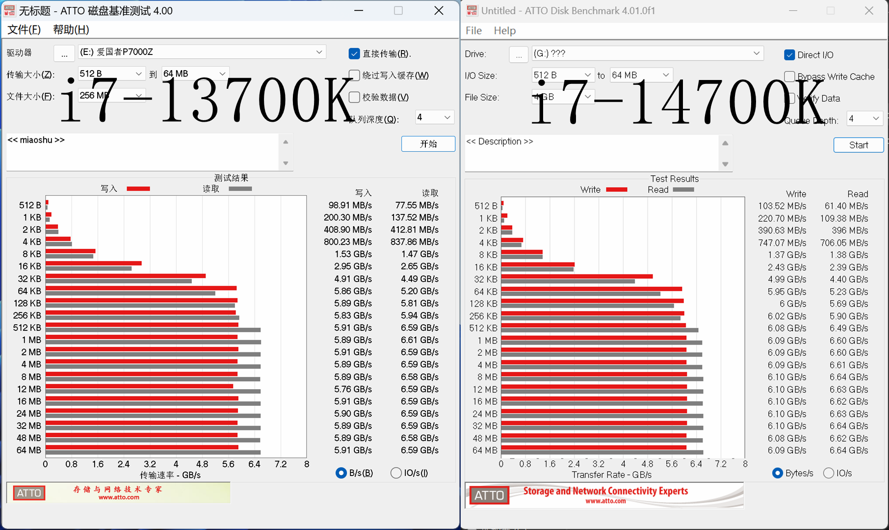 然后我顺手跑了一下同样主板电源配置下换i7-13700K的ATTO读写,可以看到在i7-13700K的支持下,爱国者P7000Z的写入速度其实一直维持在5.9GB/s,相对于i7-14700K的支持来说,弱了那么一丢丢。所以其实升级更好的CPU,即使是啥都不变,原来设备的性能也能得到更好的发挥。