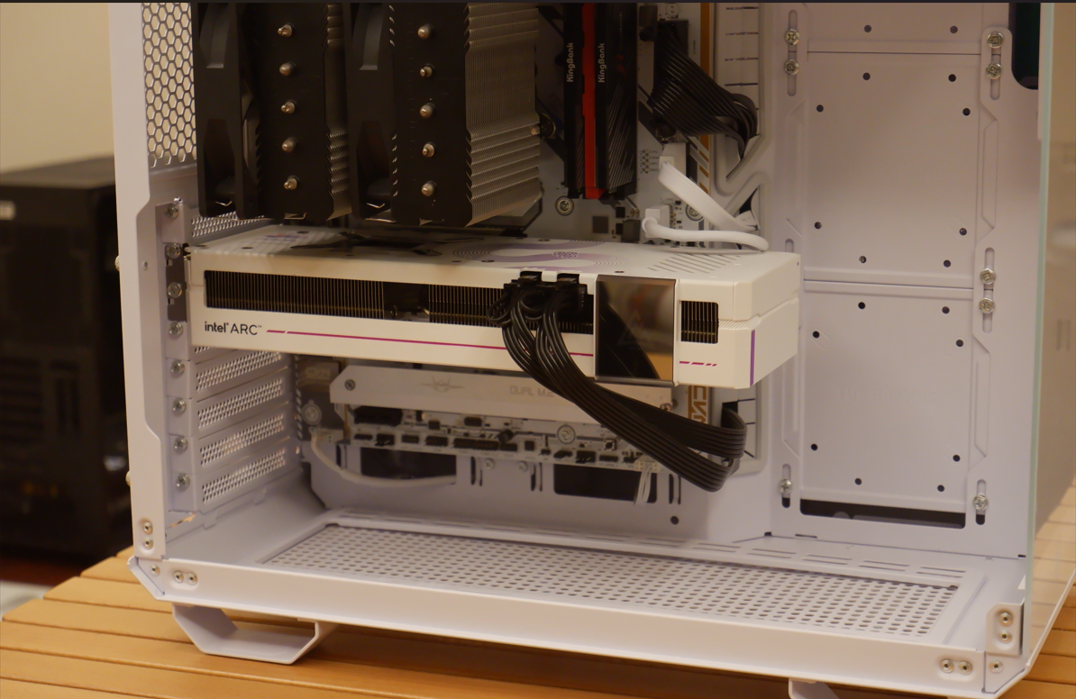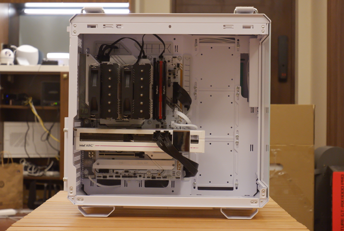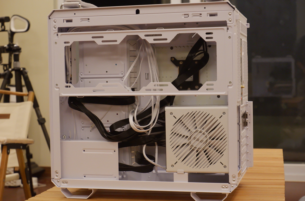 我七彩虹Z790 D5 Gaming Frozen的大板扔在GT502的机箱里毫无违和感,因为都是银白色配色设计,并且得益于GT502宽裕的背板空间,我所有的线都能藏在里面,即使是我的双塔风冷风扇也能完全容纳进去。