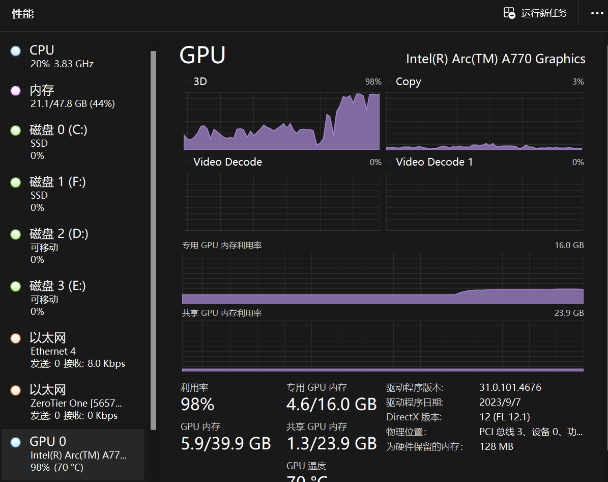 A770的显卡应该也是目前Intel已发售的最高端的显卡了,我这块是蓝戟A770亚运版,显存16GB,满载跑起来其实也就200w左右的功耗,考虑到它的编码效率,我觉得这个功耗几乎是可以忽略不计了。