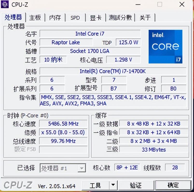 上CPU-Z看了看参数,i7-14700K的TDP识别出来是125W,还是1700LGA的插槽,核心频率5.4GHz,核心部分是8个大核12个小核,也就是它是20核28线程,三级缓存给的是33MB。