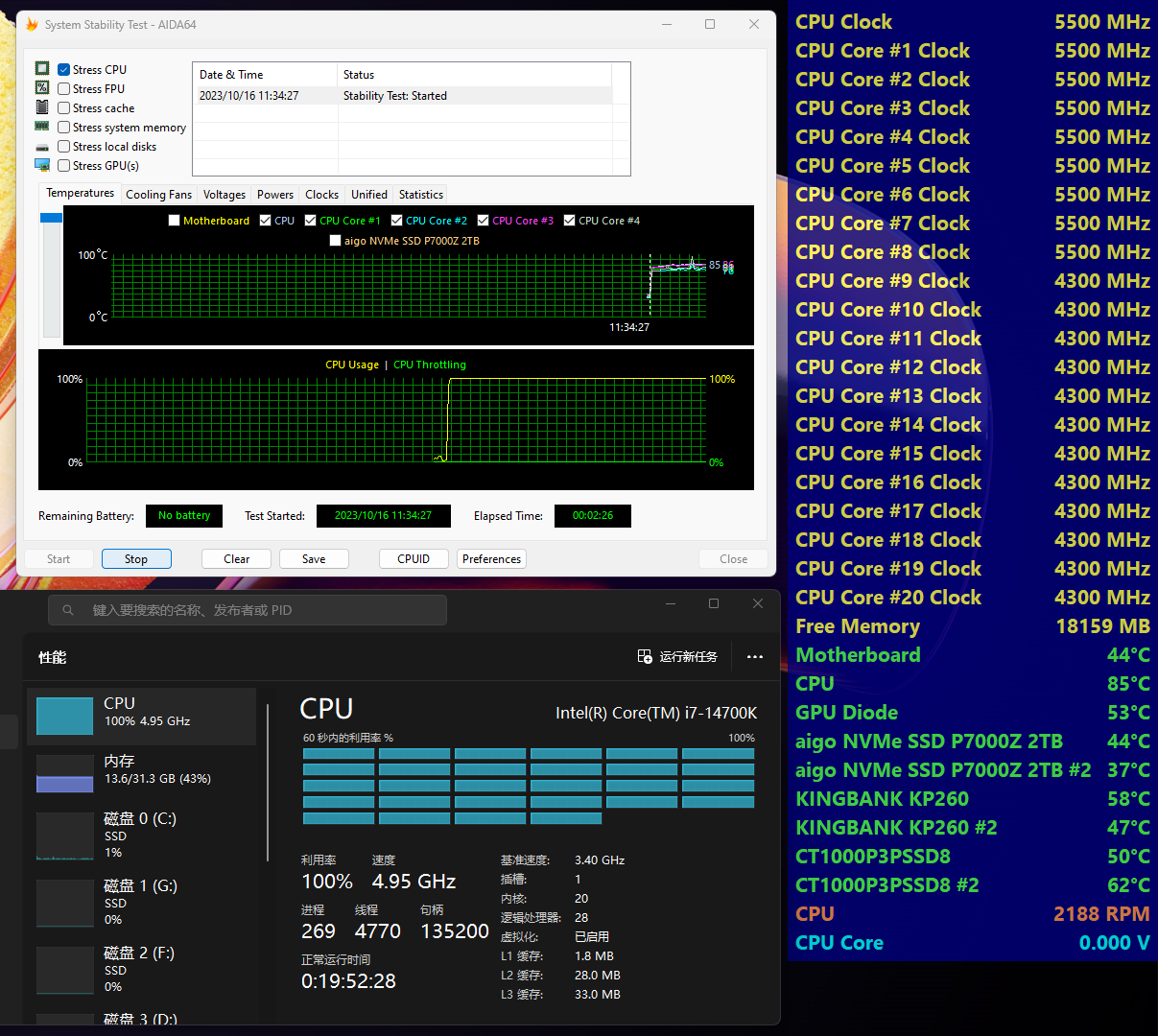 对比结果就是,只换U的前提下,我蓝戟A770的显卡的利用率更好了,爱国者P7000Z的读写更高了,七彩虹Z790的主板供电也并没有限制,反倒是稳稳当当撑起来了更高的功耗。