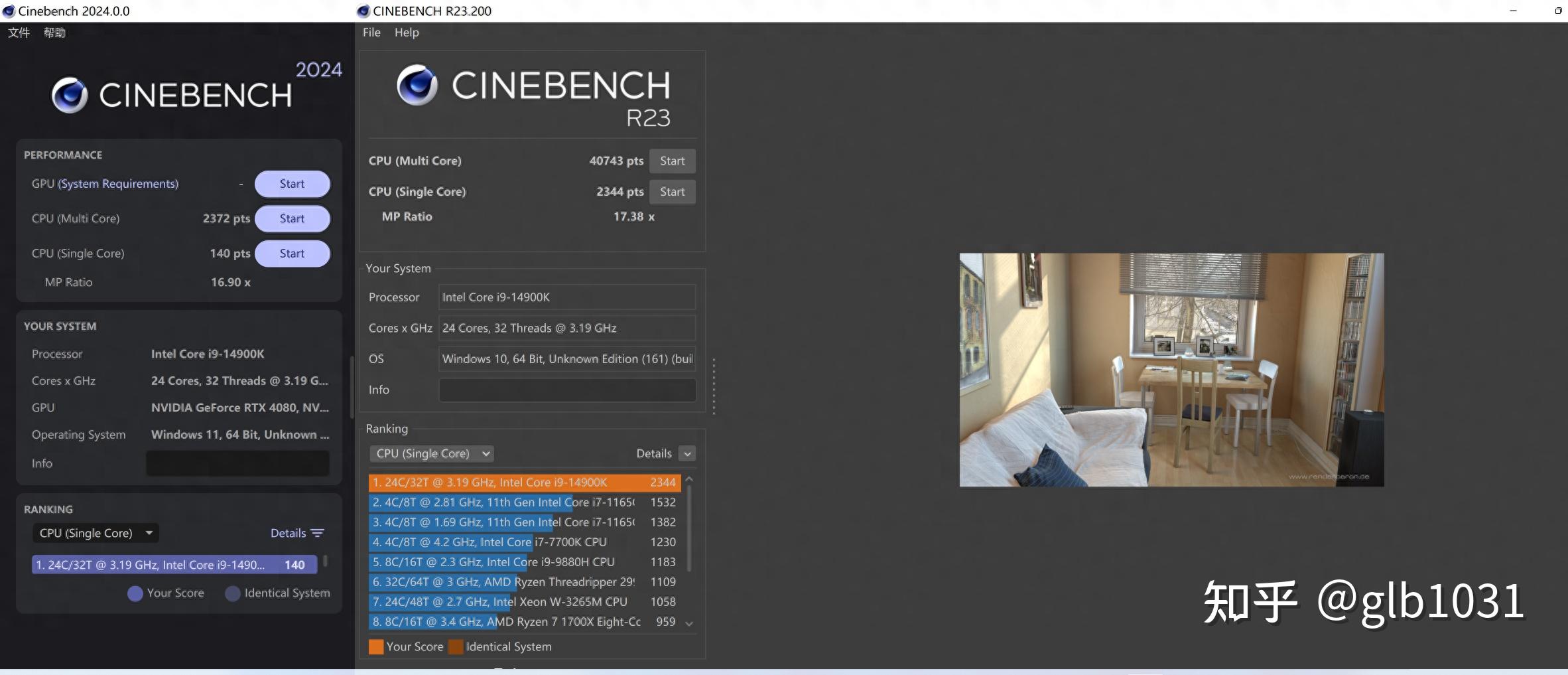 Cinebench R23、Cinebench 2024的测试方面,14900K的R23测试CPU多核分为 40743pts,单核 2344 pts;2024测试CPU多核分为 2372 pts,单核 140 pts。