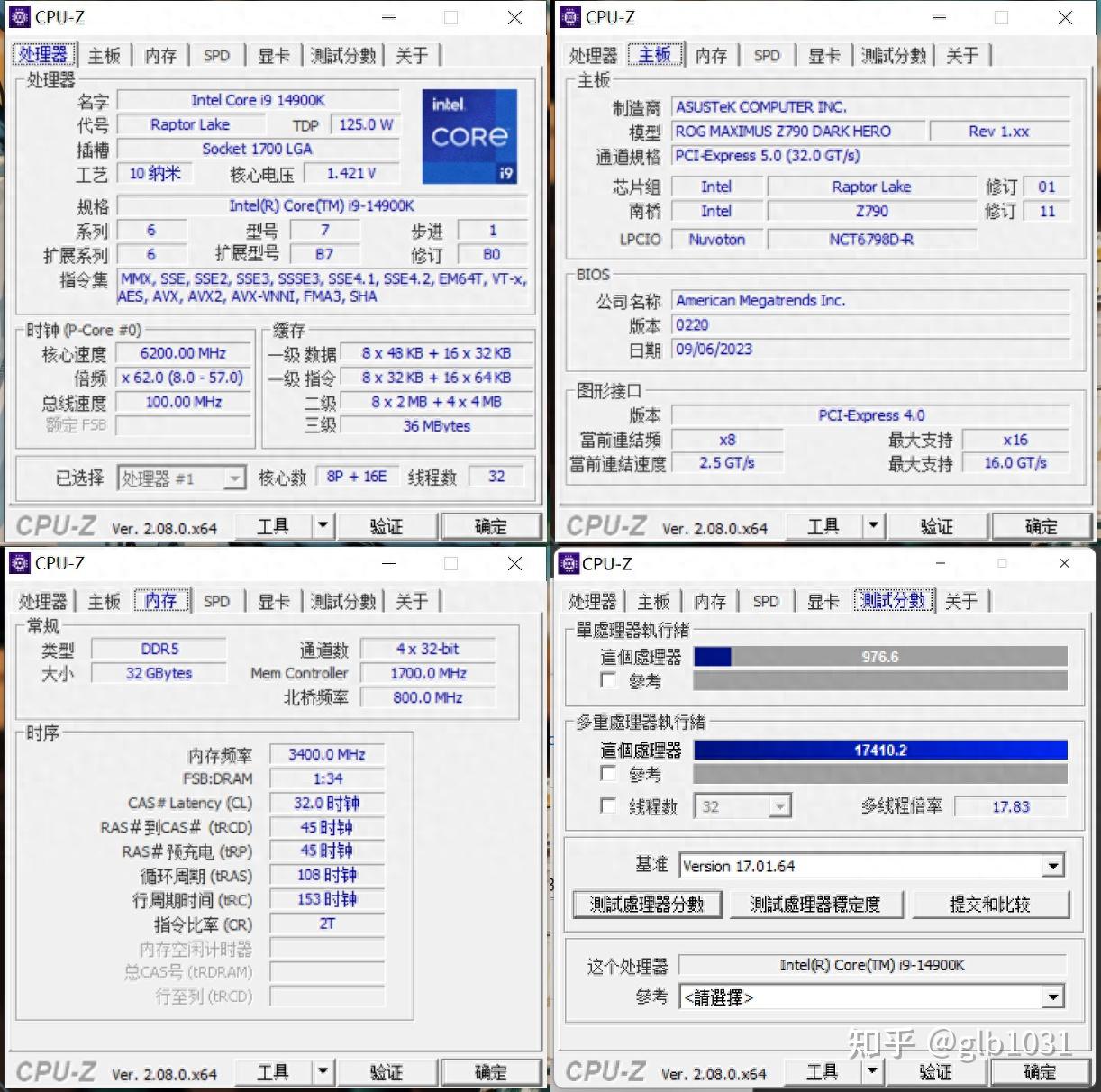 i9 14900K的CPU-Z多核得分17410.2、单核976.6;