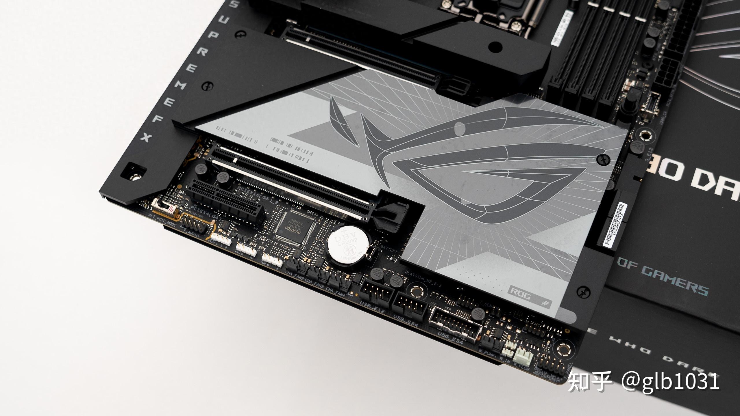 主板下方覆盖了大面积的散热装机,ROG 败家之眼Logo 也采用了全新设计。两个PCIe 5.0 x16 扩展插槽均覆盖了金属保护罩。